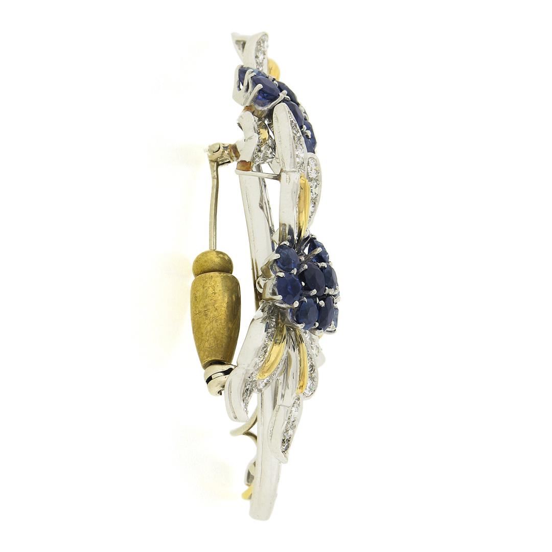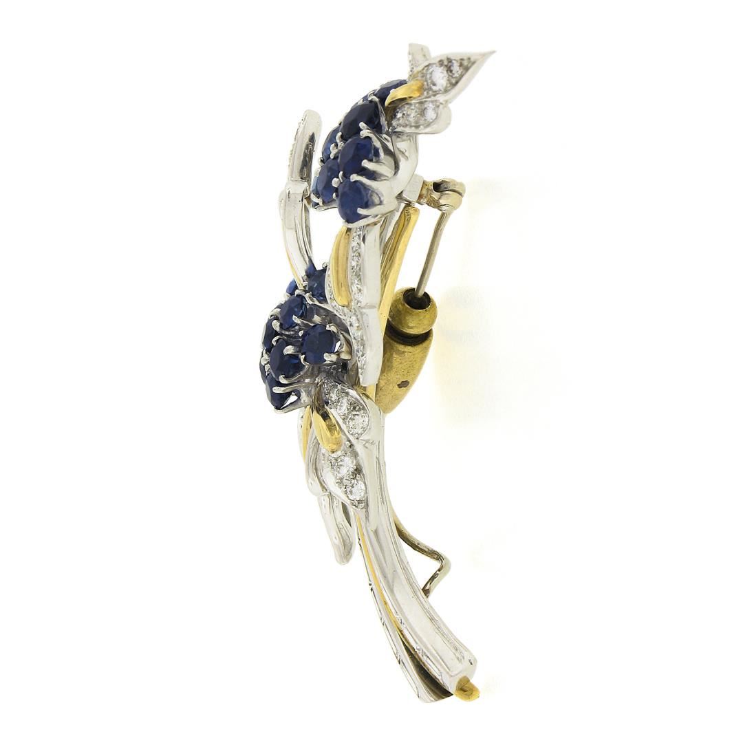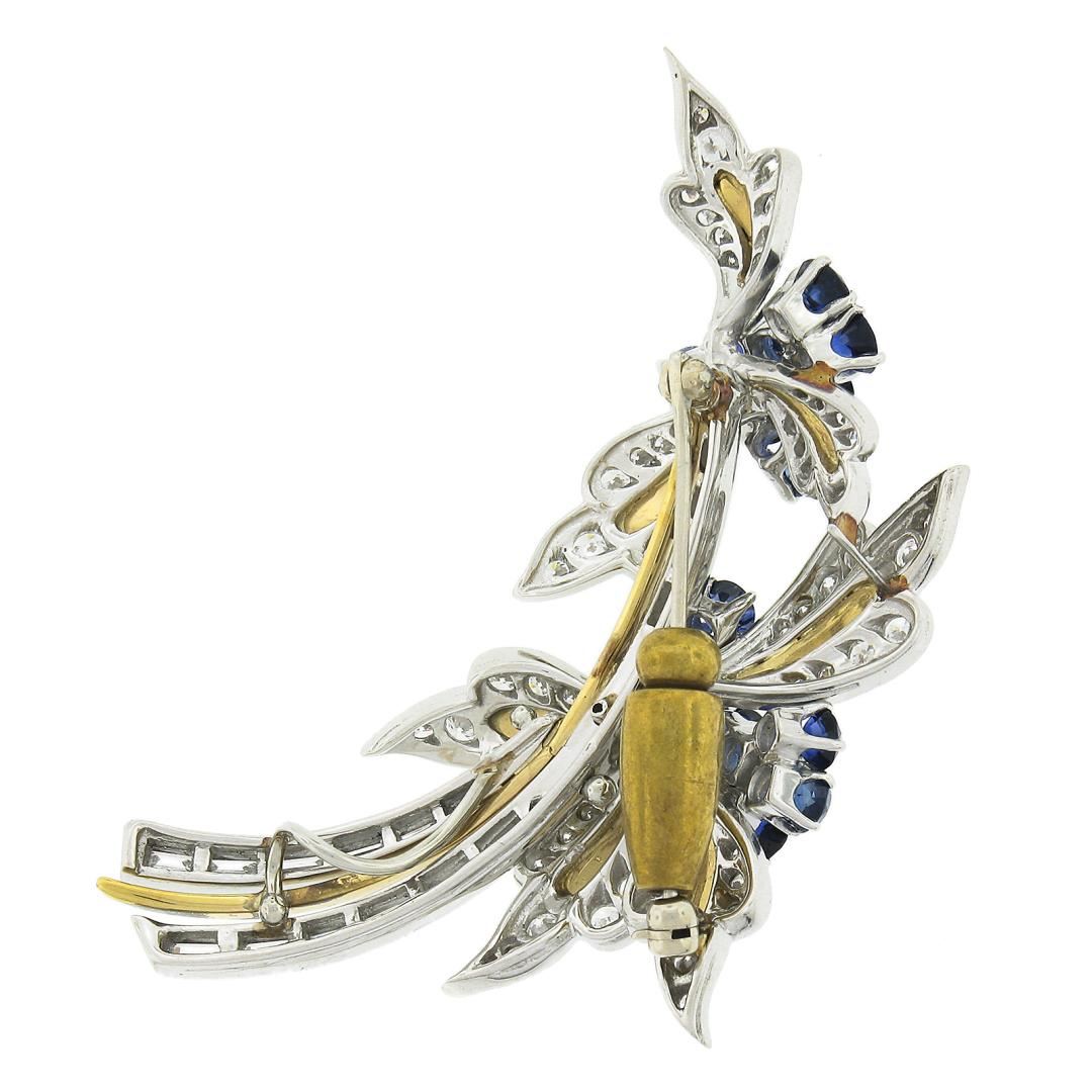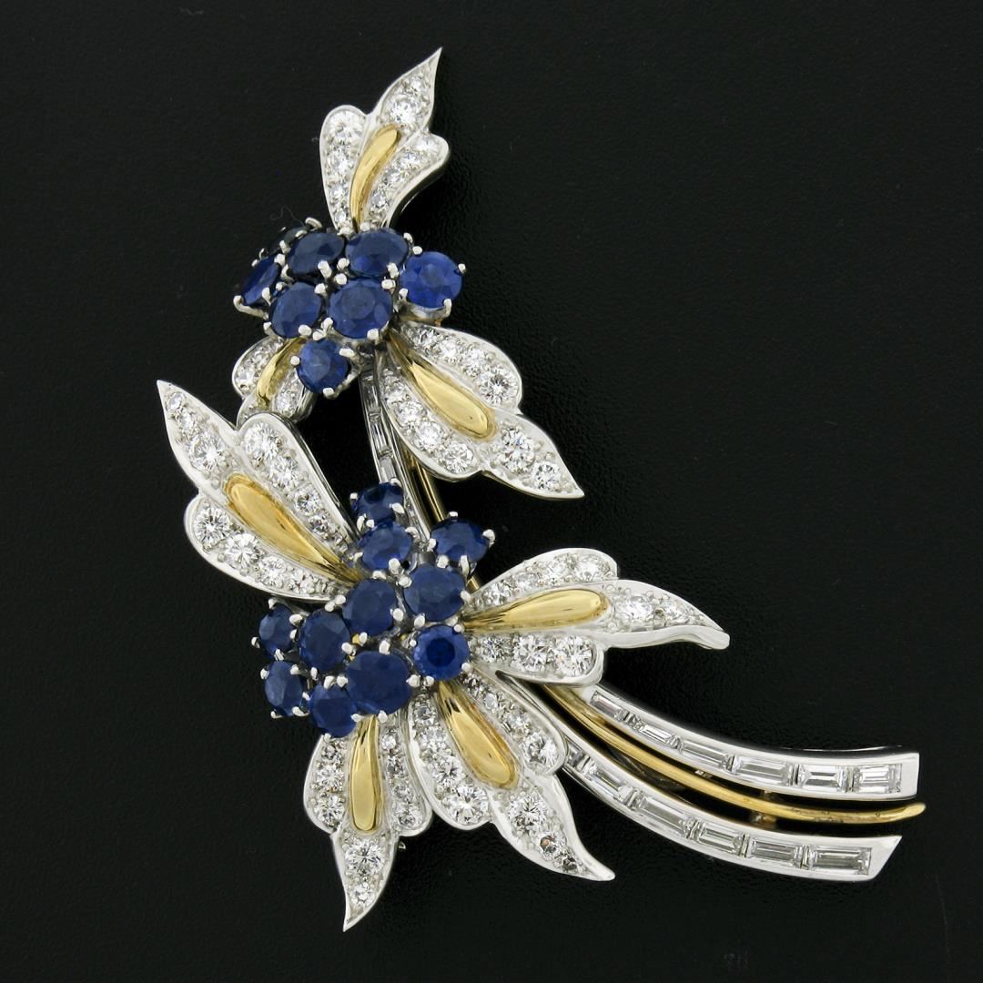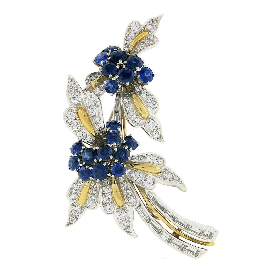 A vintage 18k yellow gold & platinum flower brooch, with GIA graded 19 round cut natural sapphires (4.60ctw), 68 round & single cut natural diamonds (E/F - VS1/VS2 ; 1.40ctw), with 12 straight baguette cut natural diamonds ( F/G - VS1/VS2 ; 0.60ctw). Measures 40.6x56.1mm and weighs a total of 28.95 grams. Comes with all original relevant certifications.