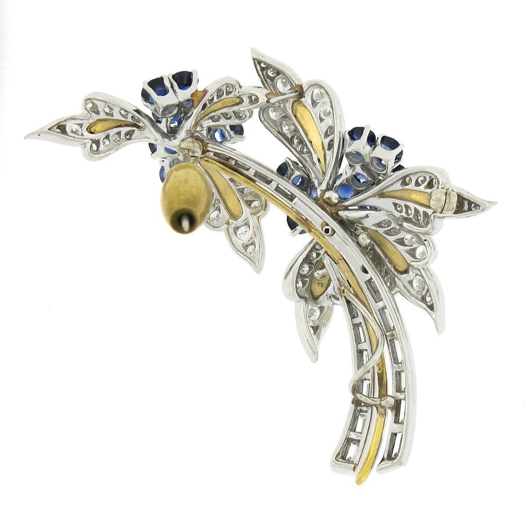 A vintage 18k yellow gold & platinum flower brooch, with GIA graded 19 round cut natural sapphires (4.60ctw), 68 round & single cut natural diamonds (E/F - VS1/VS2 ; 1.40ctw), with 12 straight baguette cut natural diamonds ( F/G - VS1/VS2 ; 0.60ctw). Measures 40.6x56.1mm and weighs a total of 28.95 grams. Comes with all original relevant certifications.