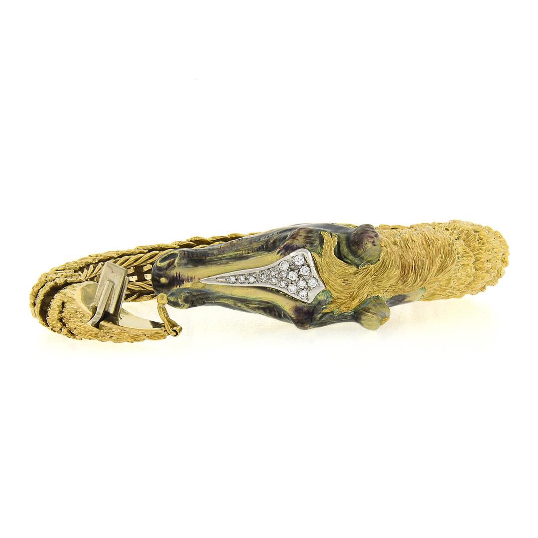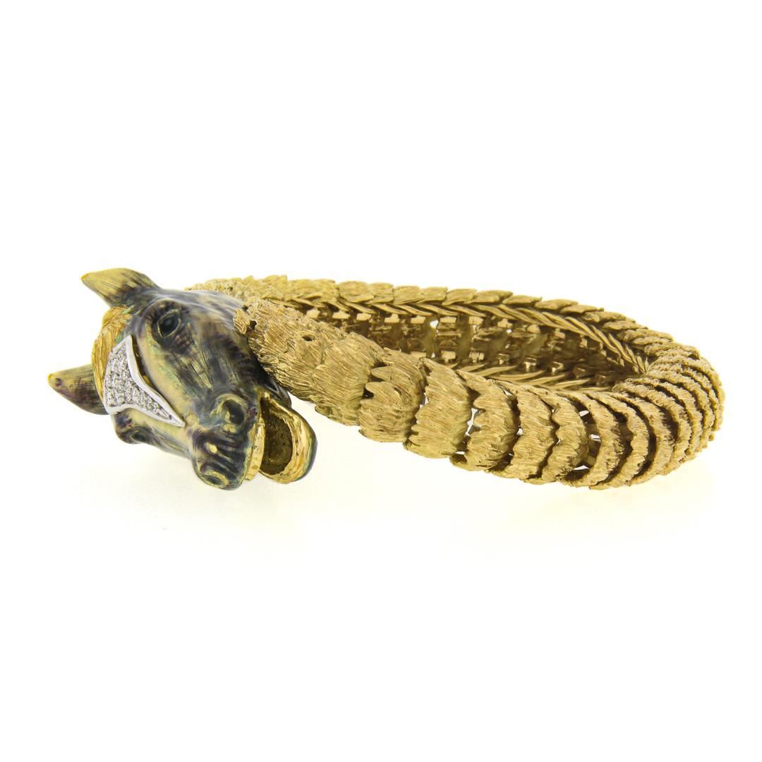 A vintage solid 18k yellow gold & enamel work head horse bracelet, with 16 round & single cut natural dimaonds (G/H - VS1/VS2 ; 0.20ctw). It weighs a total of 112.3 grams, measures 19.5mm wide, and measures 6.75 inches in length.