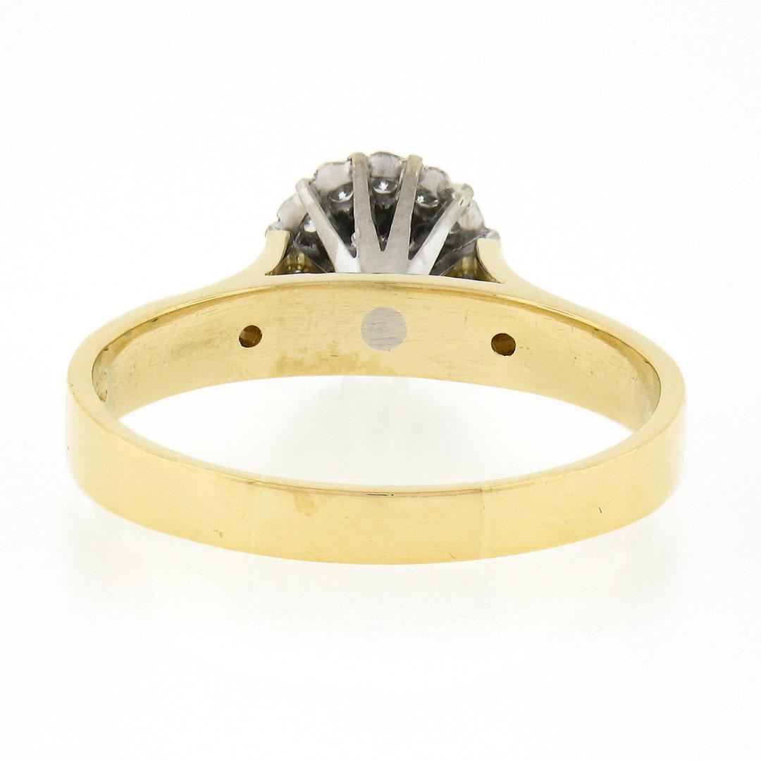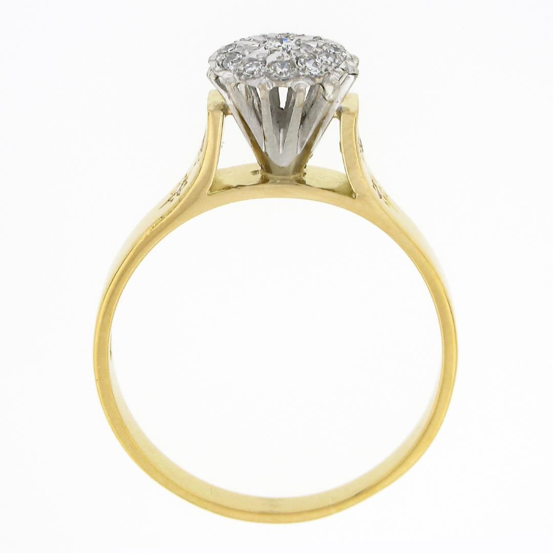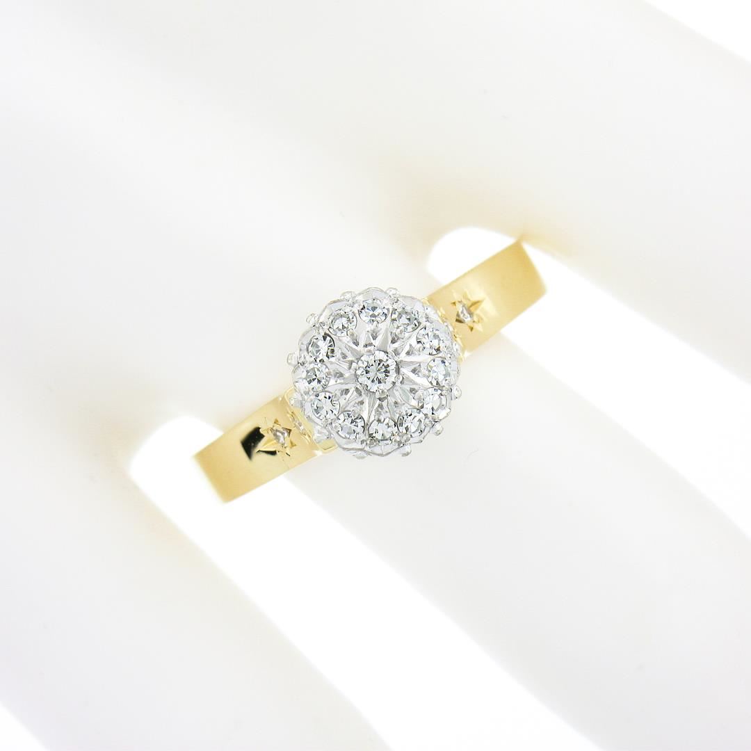 A vinatge solid 18k two tone gold cluster ring, with 17 round brilliant & old single cut natrual diamonds (E/F - VS1/VS2 ; 0.30ctw). The ring is size 10.0, weighs a total of 5.0 grams, and measures 8.70mm wide.