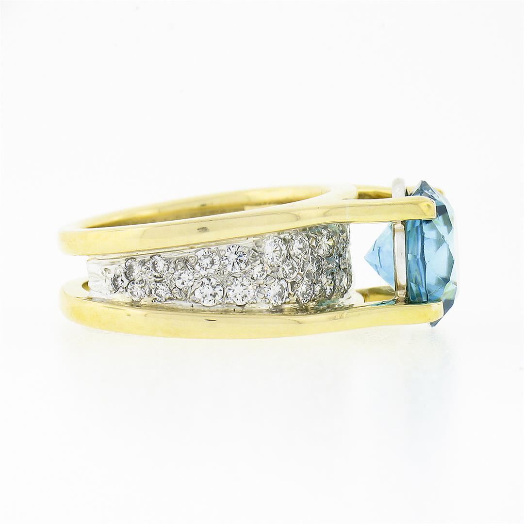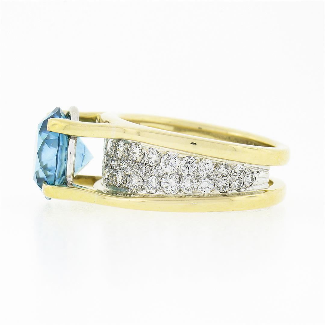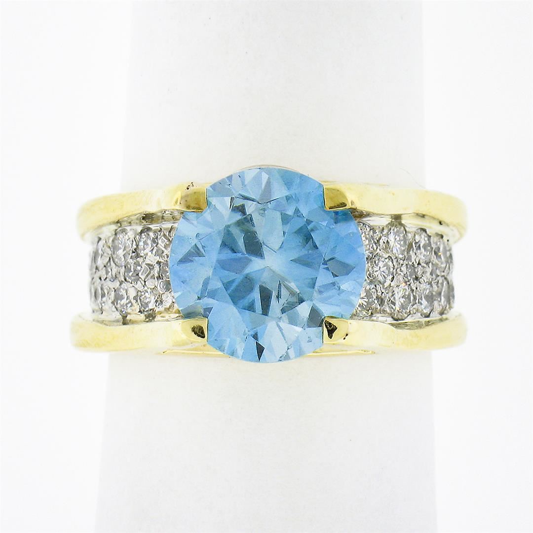 A vintage solid 18k yellow and white gold ring, with 1 Gia certified round brilliant cut blue zircon, and 45 round brilliant cut natural diamonds (G/H - VS1/VS2 ; 0.80ctw). The ring is size 6.25, weighs a total of 11.24 grams, and measures 9.80mm wide. Comes with all original relevant certifications.