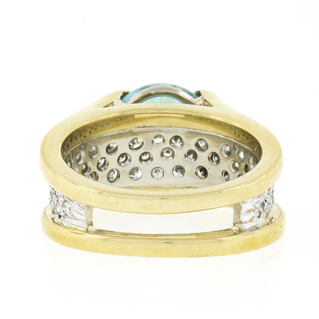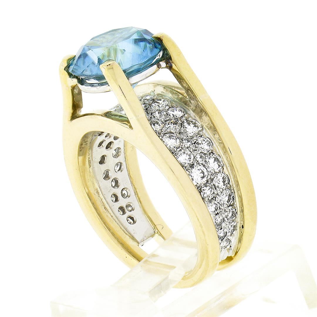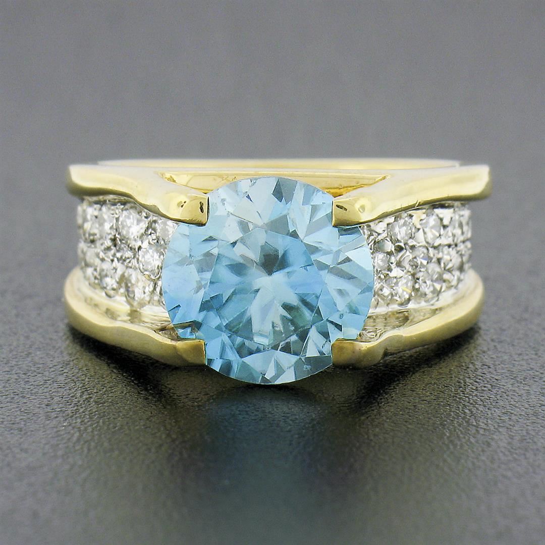 A vintage solid 18k yellow and white gold ring, with 1 Gia certified round brilliant cut blue zircon, and 45 round brilliant cut natural diamonds (G/H - VS1/VS2 ; 0.80ctw). The ring is size 6.25, weighs a total of 11.24 grams, and measures 9.80mm wide. Comes with all original relevant certifications.