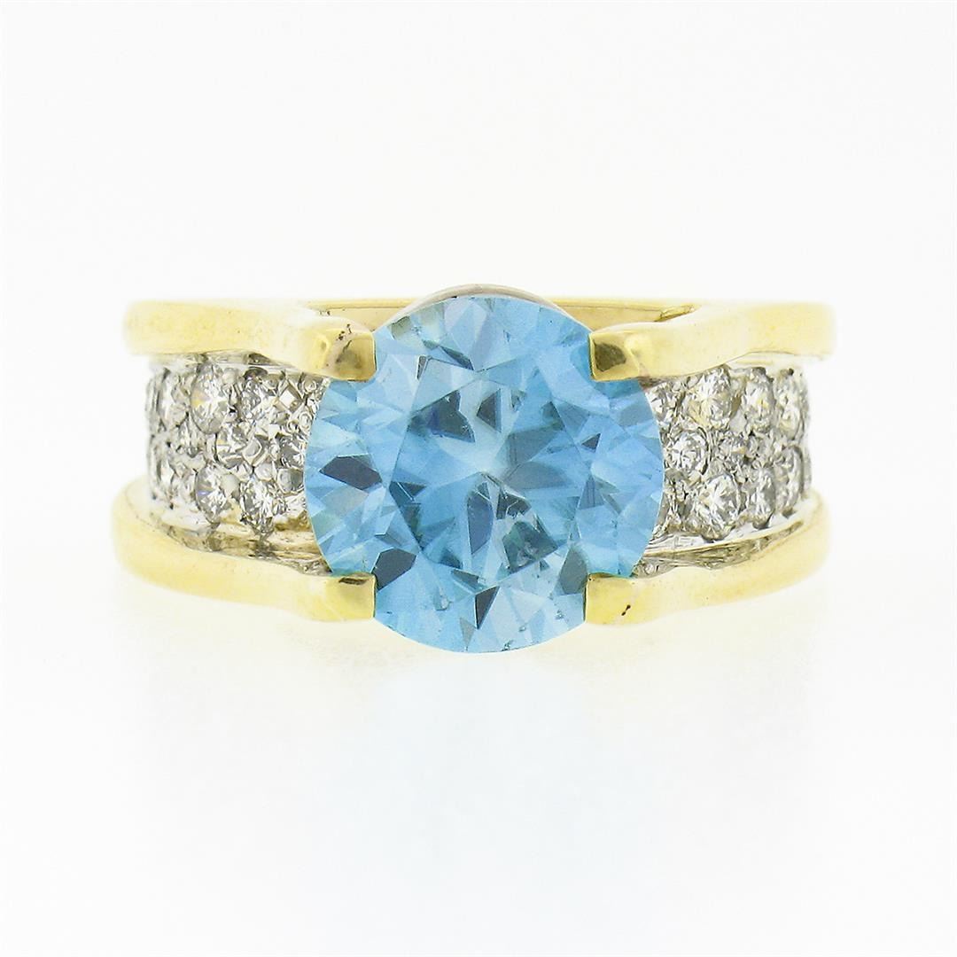 A vintage solid 18k yellow and white gold ring, with 1 Gia certified round brilliant cut blue zircon, and 45 round brilliant cut natural diamonds (G/H - VS1/VS2 ; 0.80ctw). The ring is size 6.25, weighs a total of 11.24 grams, and measures 9.80mm wide. Comes with all original relevant certifications.