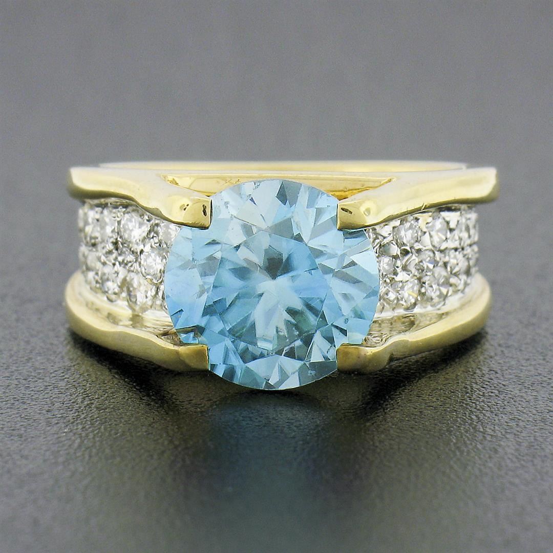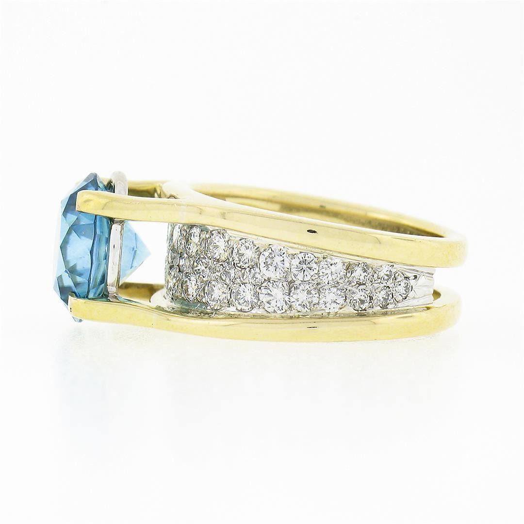 A vintage solid 18k yellow and white gold ring, with 1 Gia certified round brilliant cut blue zircon, and 45 round brilliant cut natural diamonds (G/H - VS1/VS2 ; 0.80ctw). The ring is size 6.25, weighs a total of 11.24 grams, and measures 9.80mm wide. Comes with all original relevant certifications.