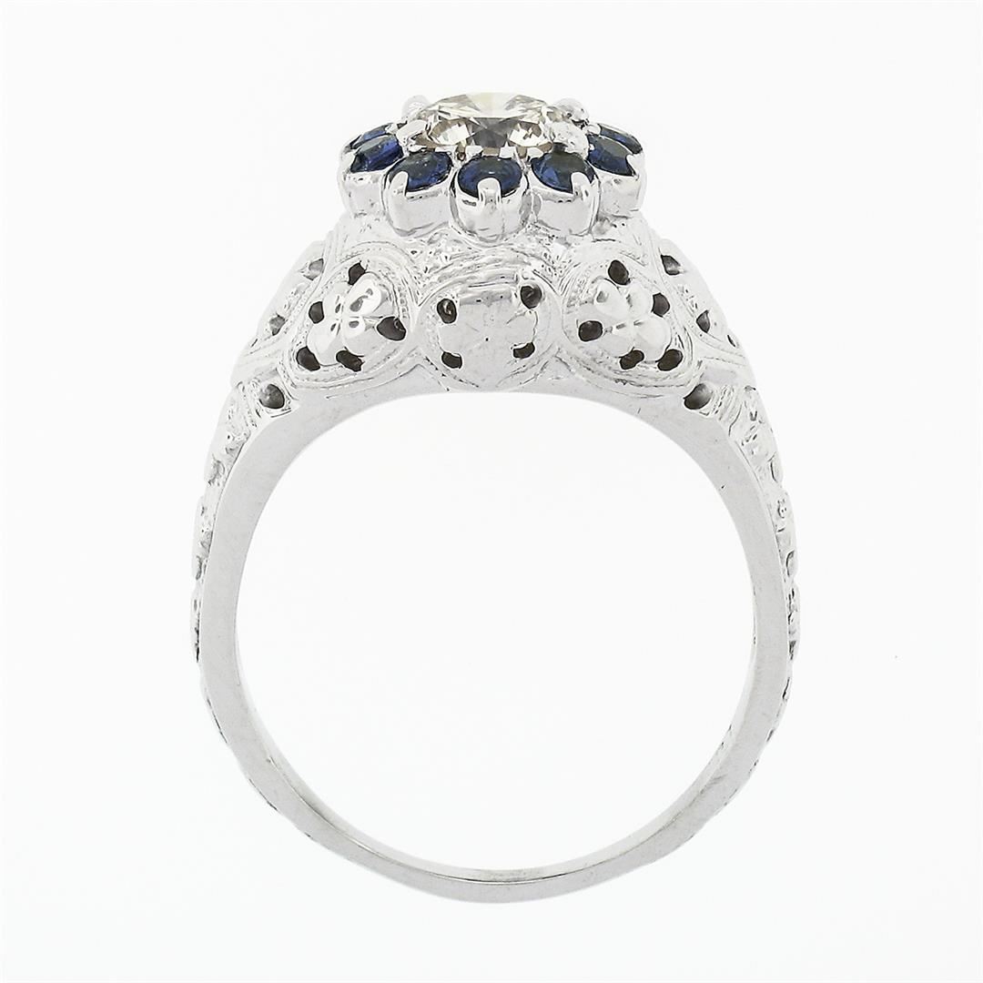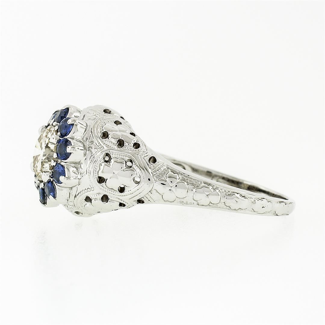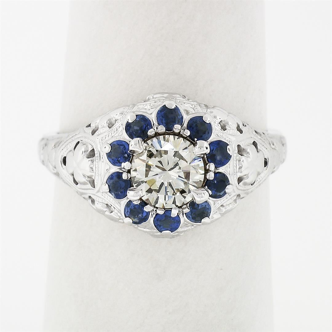 A vintage solid 18 white gold ring, with 1 round brilliant cut natural diamond (K/L - VS2 ; 0.69ct), surrounded with a halo of 10 round brilliant cut natural sapphires (0.40ctw). The ring is size 7.0, weighs a total of 6.32 grams, and measures 10.5mm wide.