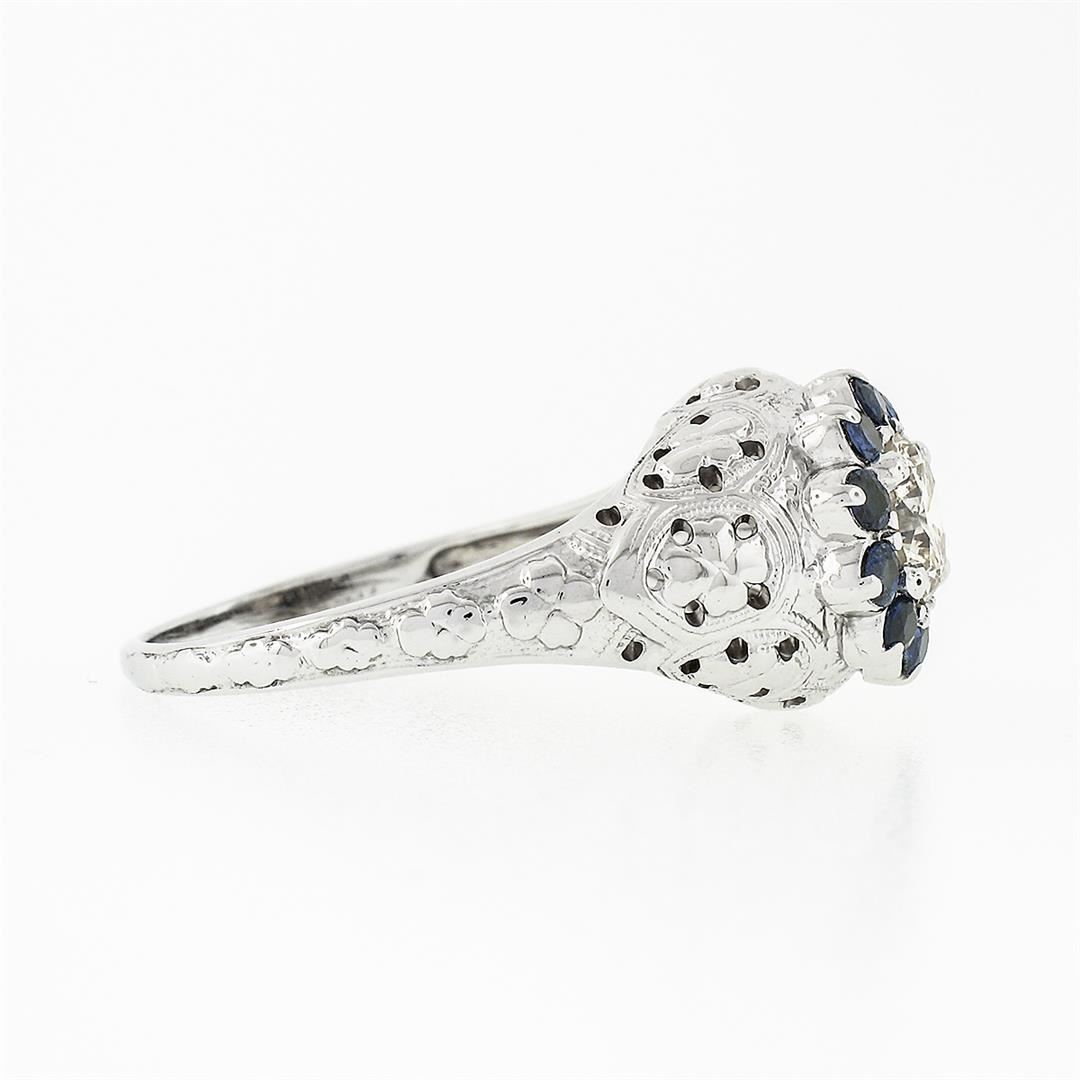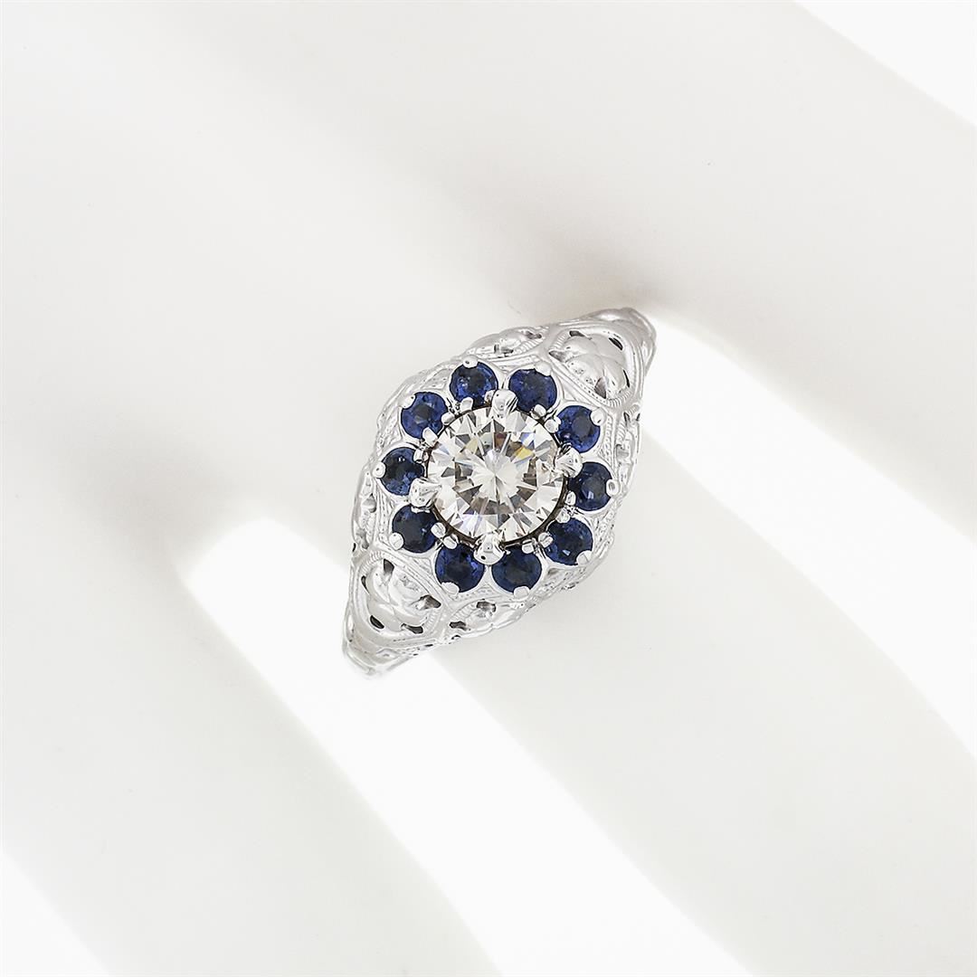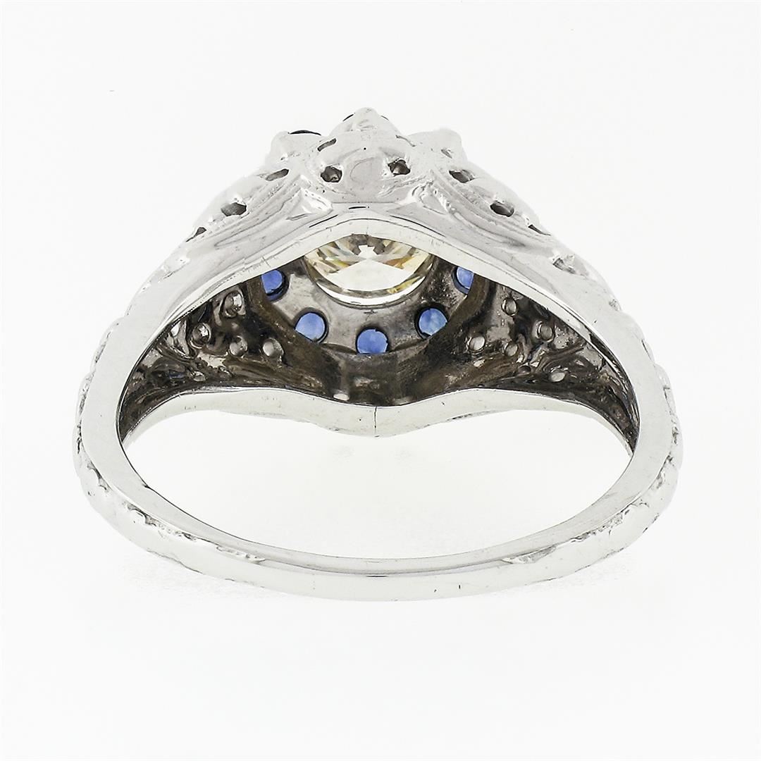 A vintage solid 18 white gold ring, with 1 round brilliant cut natural diamond (K/L - VS2 ; 0.69ct), surrounded with a halo of 10 round brilliant cut natural sapphires (0.40ctw). The ring is size 7.0, weighs a total of 6.32 grams, and measures 10.5mm wide.