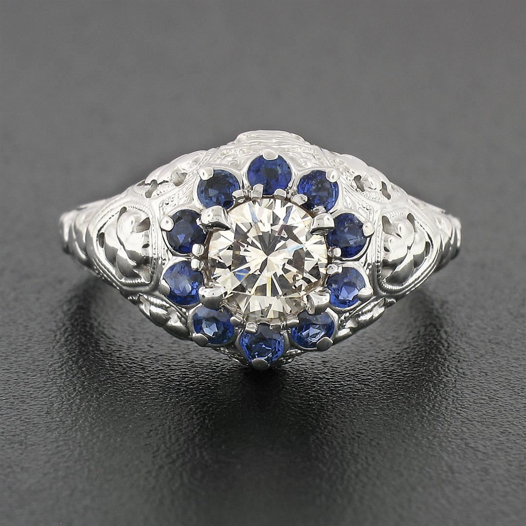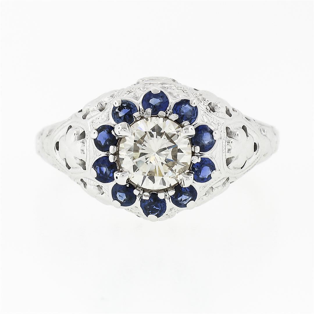 A vintage solid 18 white gold ring, with 1 round brilliant cut natural diamond (K/L - VS2 ; 0.69ct), surrounded with a halo of 10 round brilliant cut natural sapphires (0.40ctw). The ring is size 7.0, weighs a total of 6.32 grams, and measures 10.5mm wide.