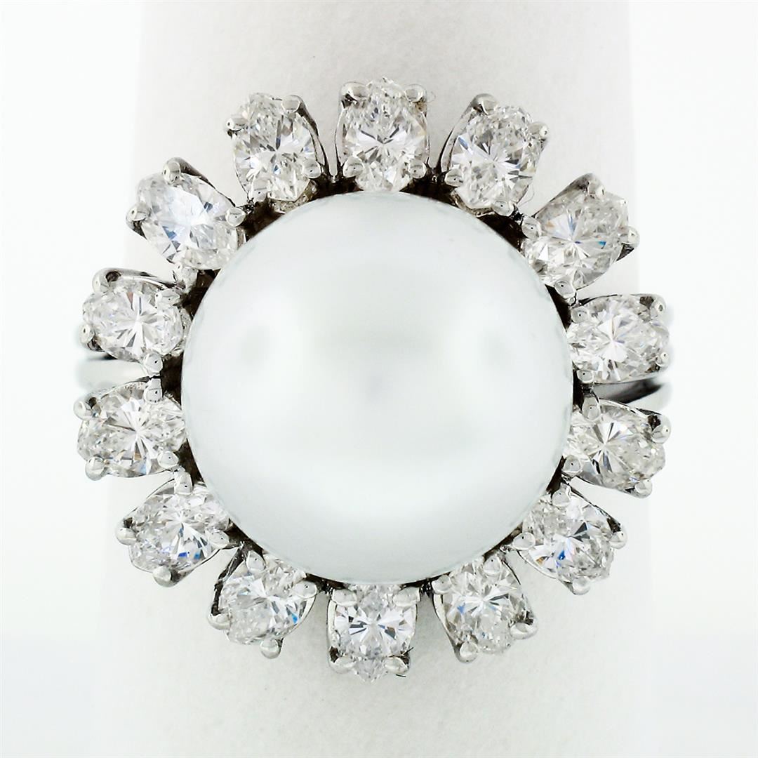 A vintage solid 18k white gold ring, with 1 round shape cultured south sea pearl (12.73mm), surrounded with a halo of 14 wide marquise cut natural diamonds (G/H- VS1/VS2; 2.10ctw). The ring is size 8.5, weighs a total of 11.28 grams, and measures 19.95mm wide.