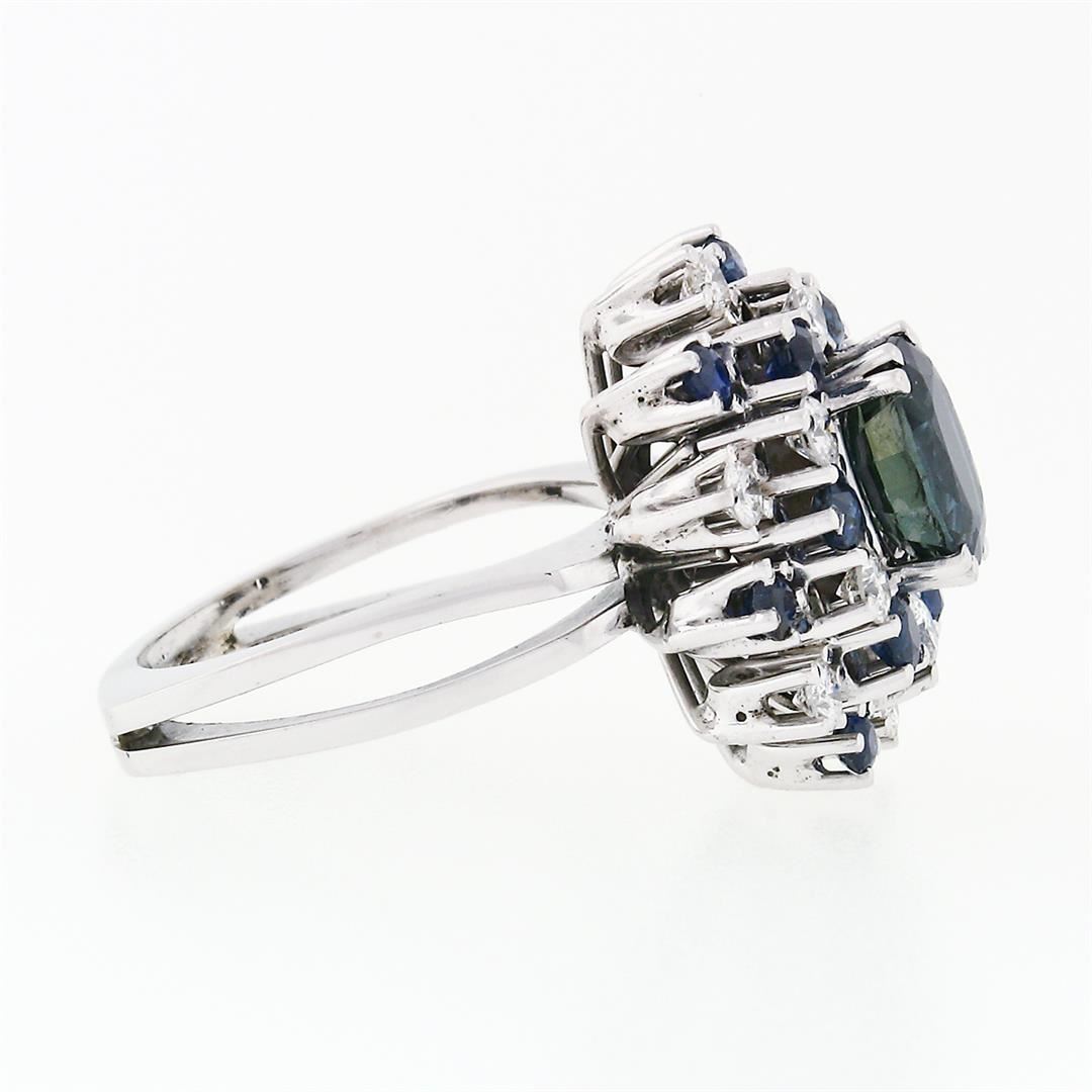 A vintage 18k white gold cocktail ring with 1 oval brilliant cut natural sapphire (1.55ct) surrounded with 12 round cut natural sapphires (1.10ctw) and 12 round brilliant cut natural diamonds (F/G - VS1; 0.50ctw). The ring is size 6.0, weighs a total of 9.44 grams, and measures 18.52mm wide.