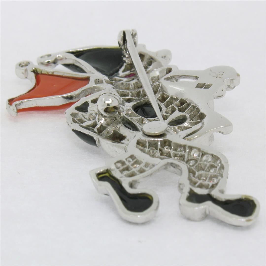 An excellent condition vintage 18k white gold mobile clown brooch pave set with 1.50ctw of round diamonds (G/H - VS1), a custom cut coral, and several custom cut black onyx. Measures 47.55x32.80mm and weighs a total of 13.92 grams.