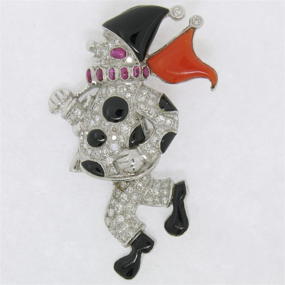 Vintage 18k White Gold Diamond Black Onyx and Coral Clown Brooch Pin