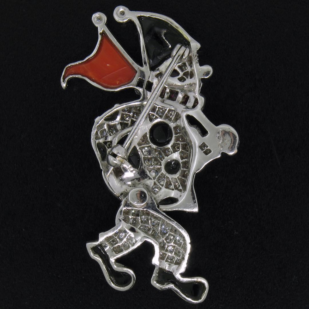 An excellent condition vintage 18k white gold mobile clown brooch pave set with 1.50ctw of round diamonds (G/H - VS1), a custom cut coral, and several custom cut black onyx. Measures 47.55x32.80mm and weighs a total of 13.92 grams.