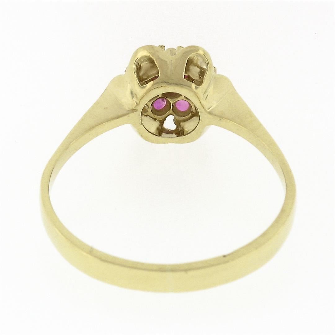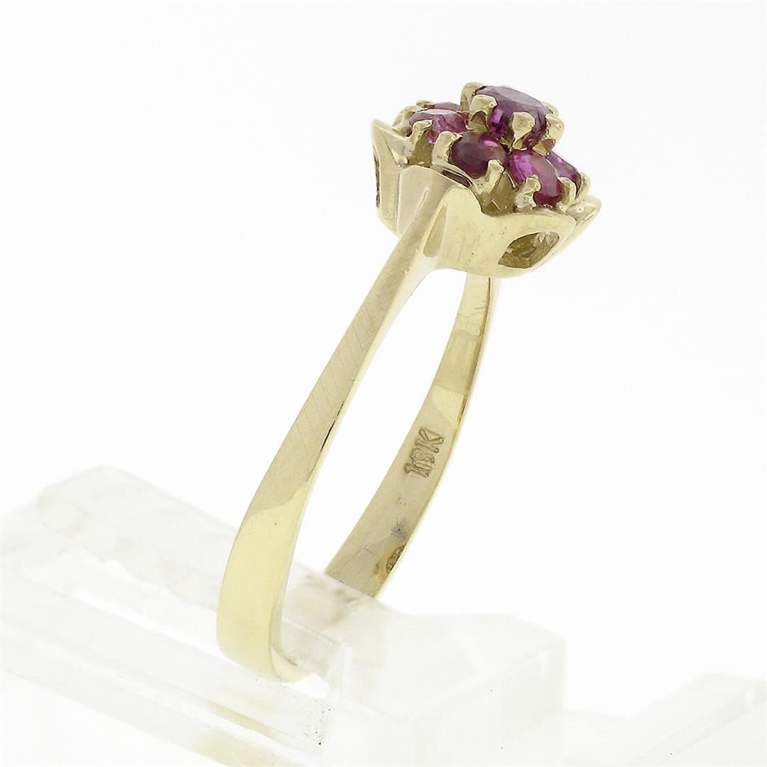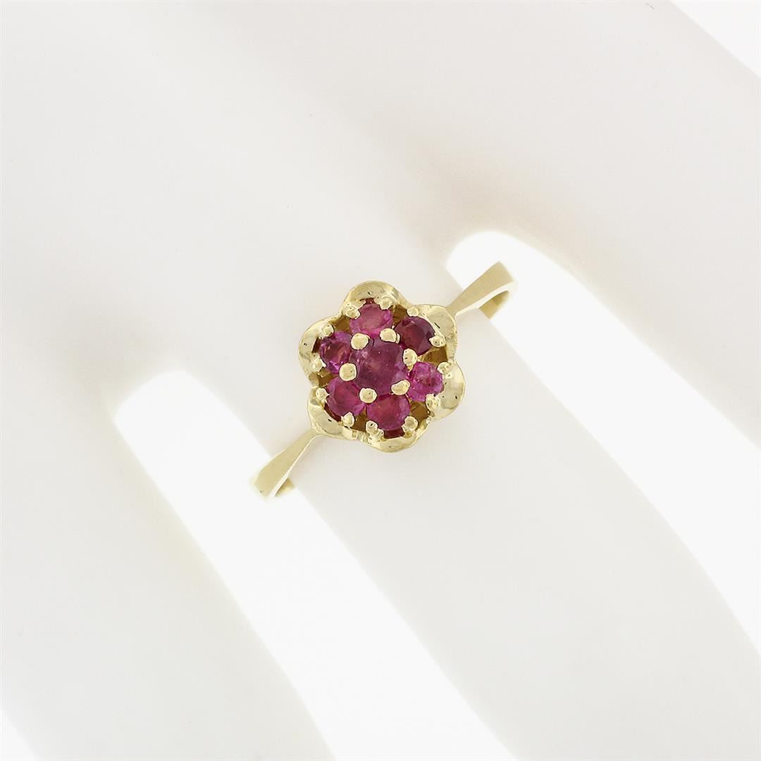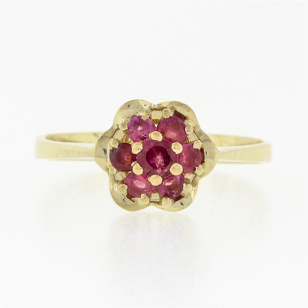 A vintage solid 18k yellow gold flower ring, featuring 7 round brilliant cut natural rubies (0.37ctw).The ring is size 5.5, weighs a total of 2.49 grams, and measures 8.15mm wide.