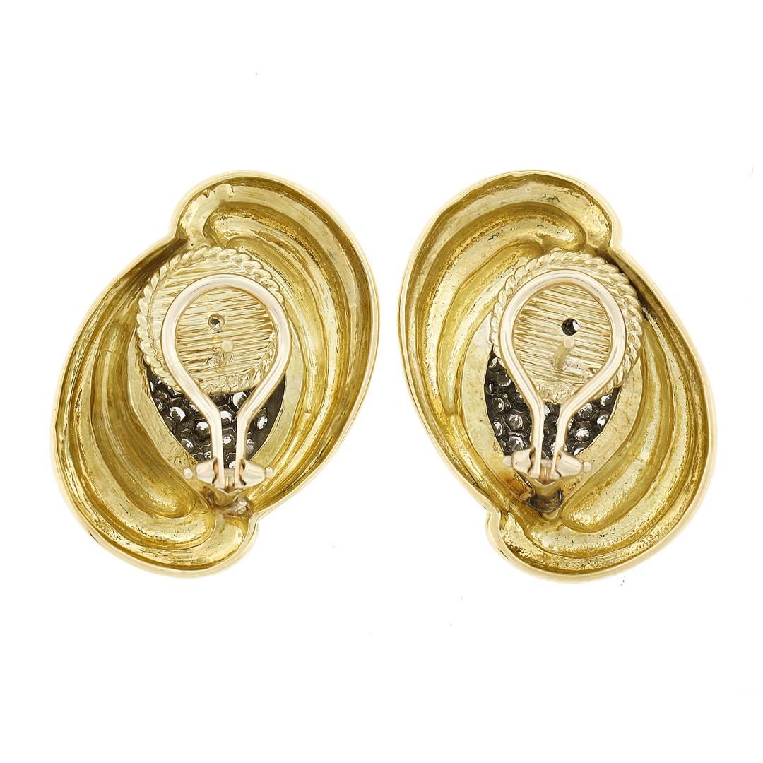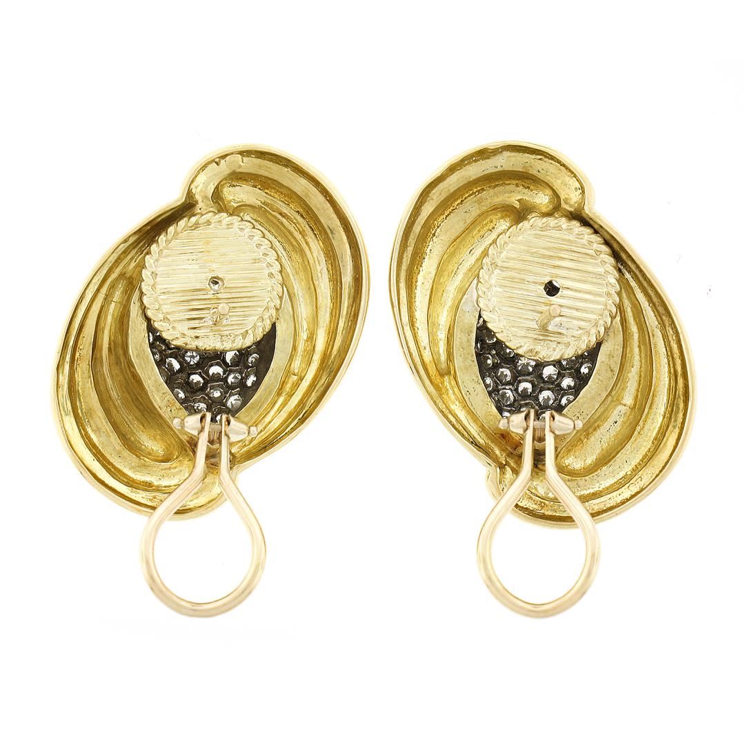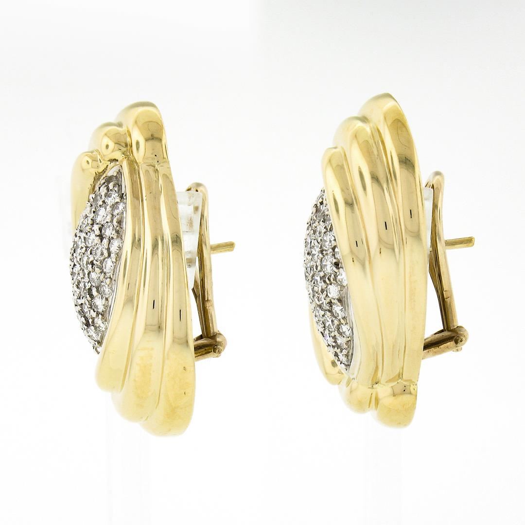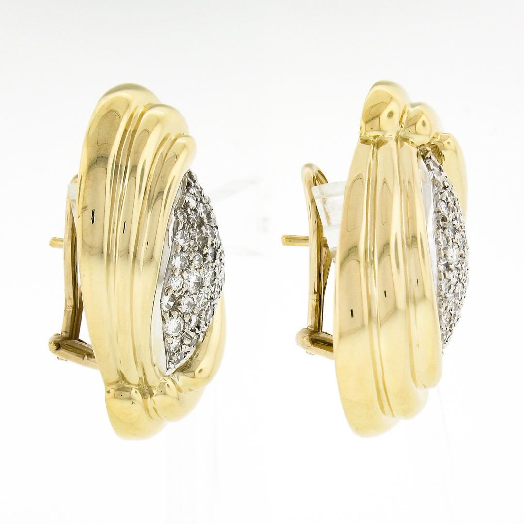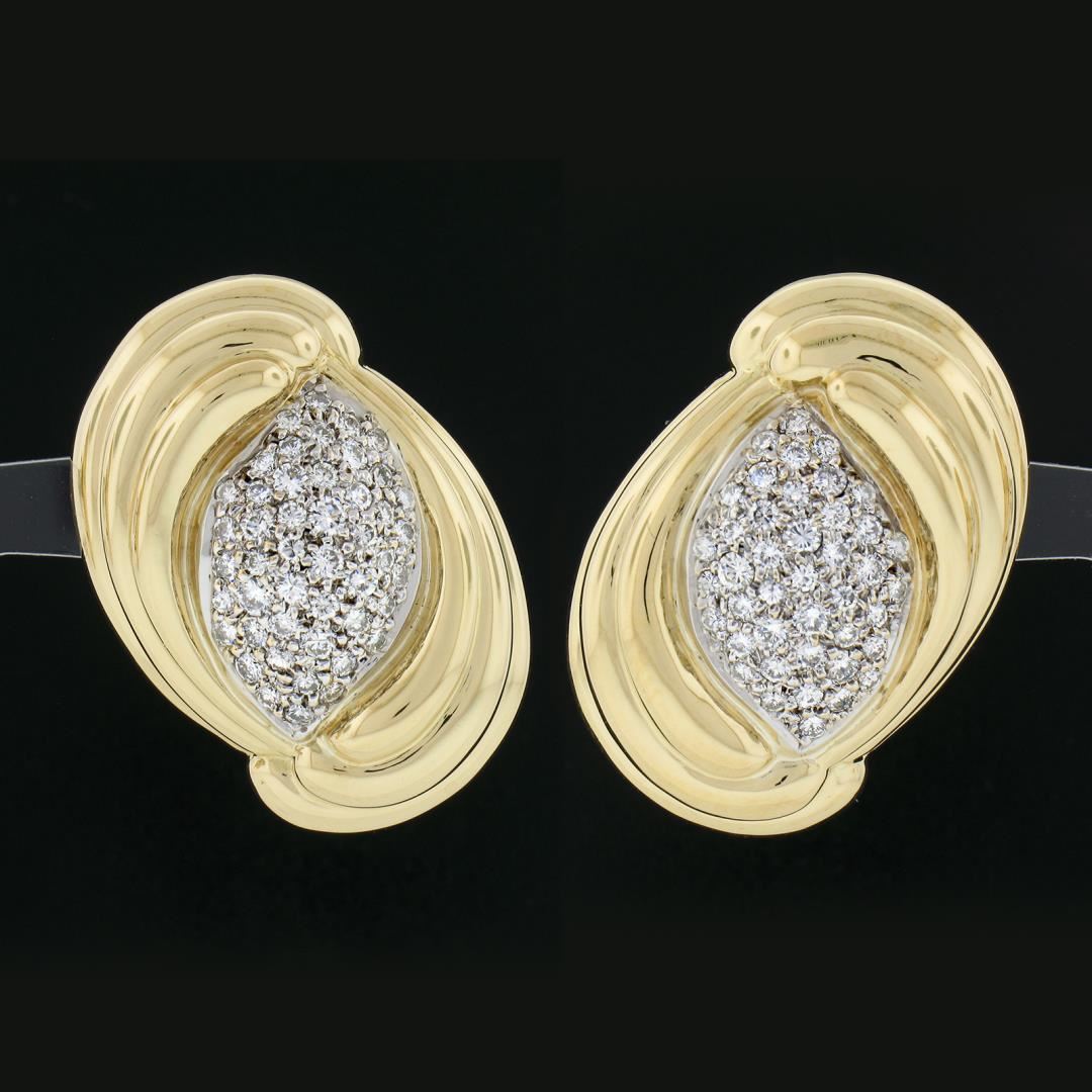A vintage solid 18k yellow & white gold earrings. with numerous round brilliant cut natrual diamonds (E/F - VVS2/VS1 ; 2.15ctw). The earrings measure approximately 31.90x22.60mm and weigh a total of 28.76 grams.