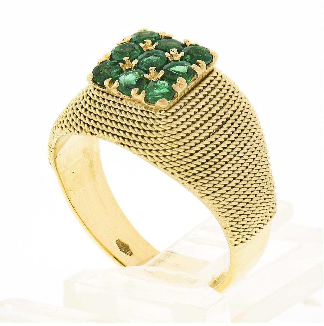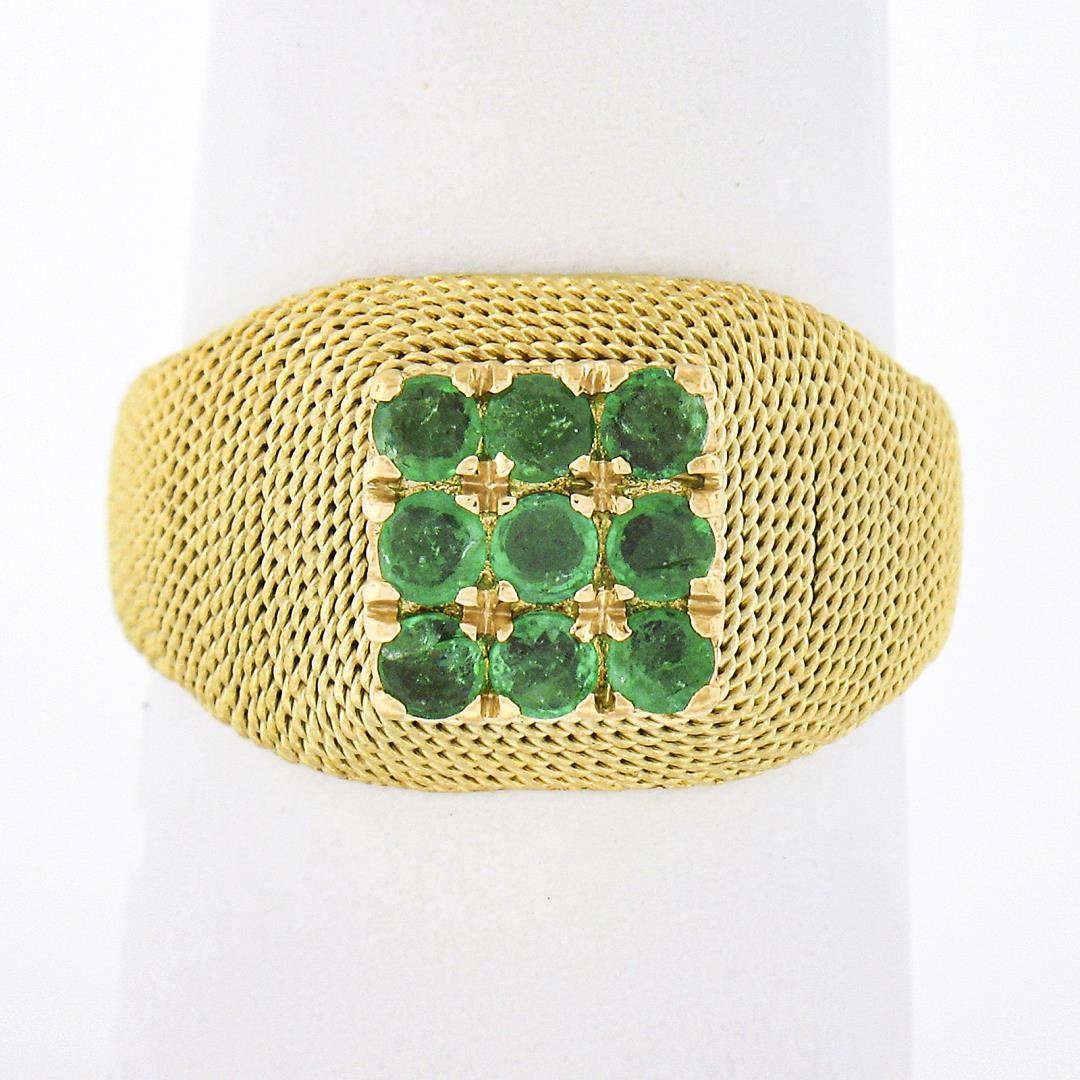 A vintage solid 18k yellow gold twisted wire ring. with 9 round brilliant cut natural emeralds (0.75ctw). The ring is size 6.5, weighs a total of 6.63 grams, and measures 11.60mm wide.
