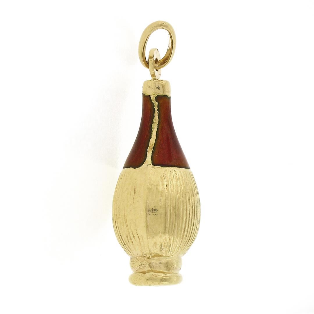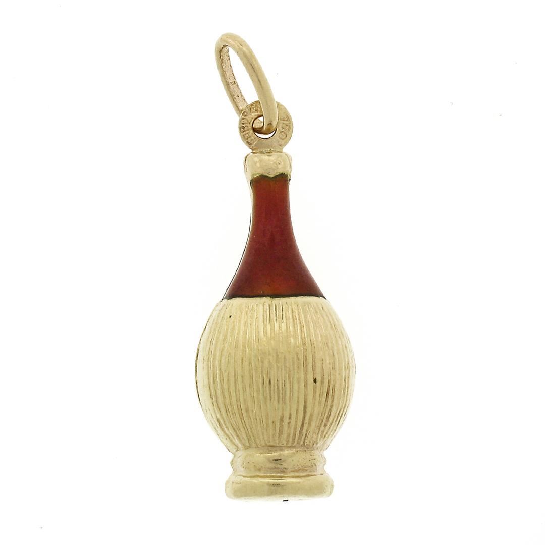 A vintage solid 18k yellow gold canister jug charm pendant, with red enamel work. The pendant weighs a total of 2.52 grams, measures 30.4x9.85mm including the bail, and the inside of the bail measures 5.4x2.6mm.
