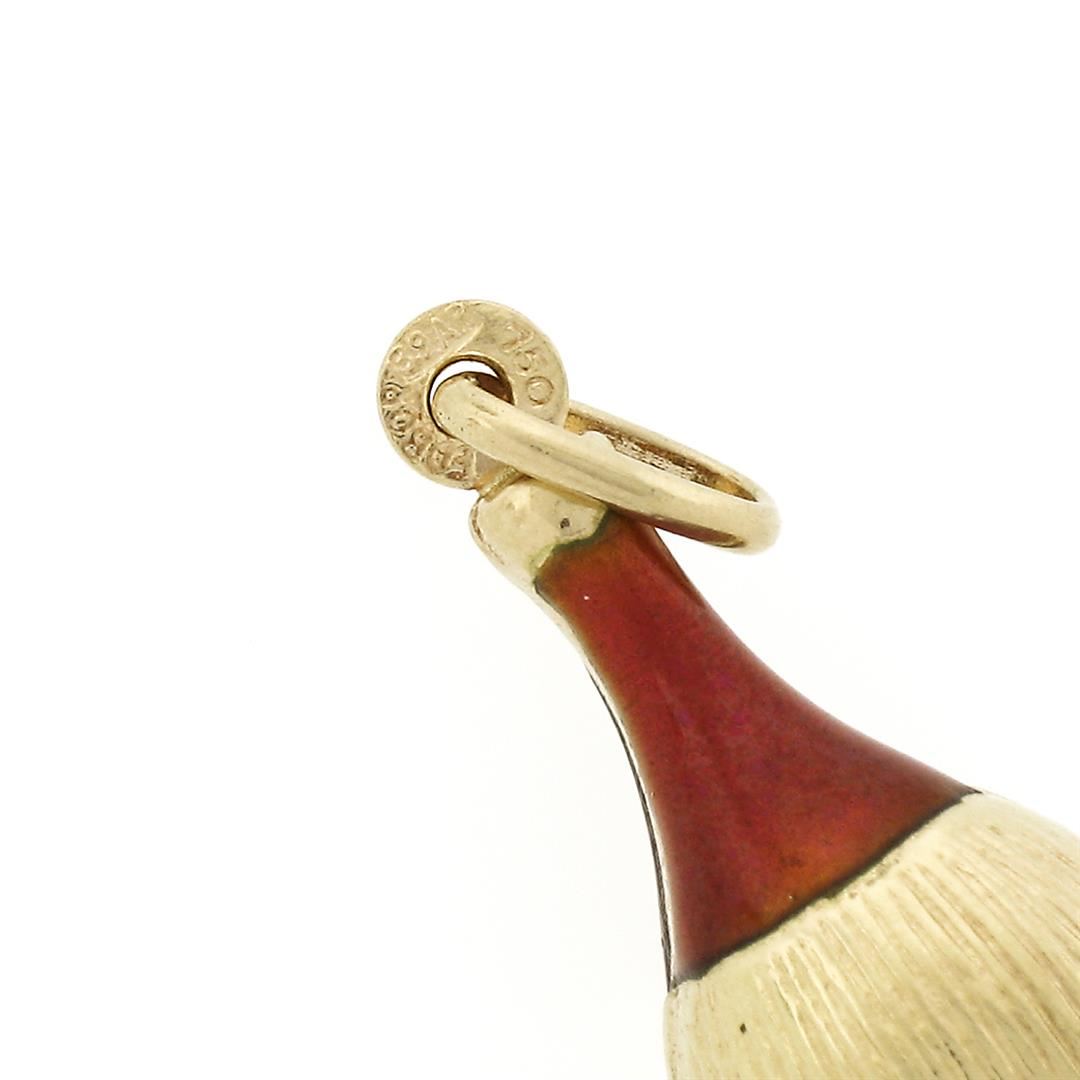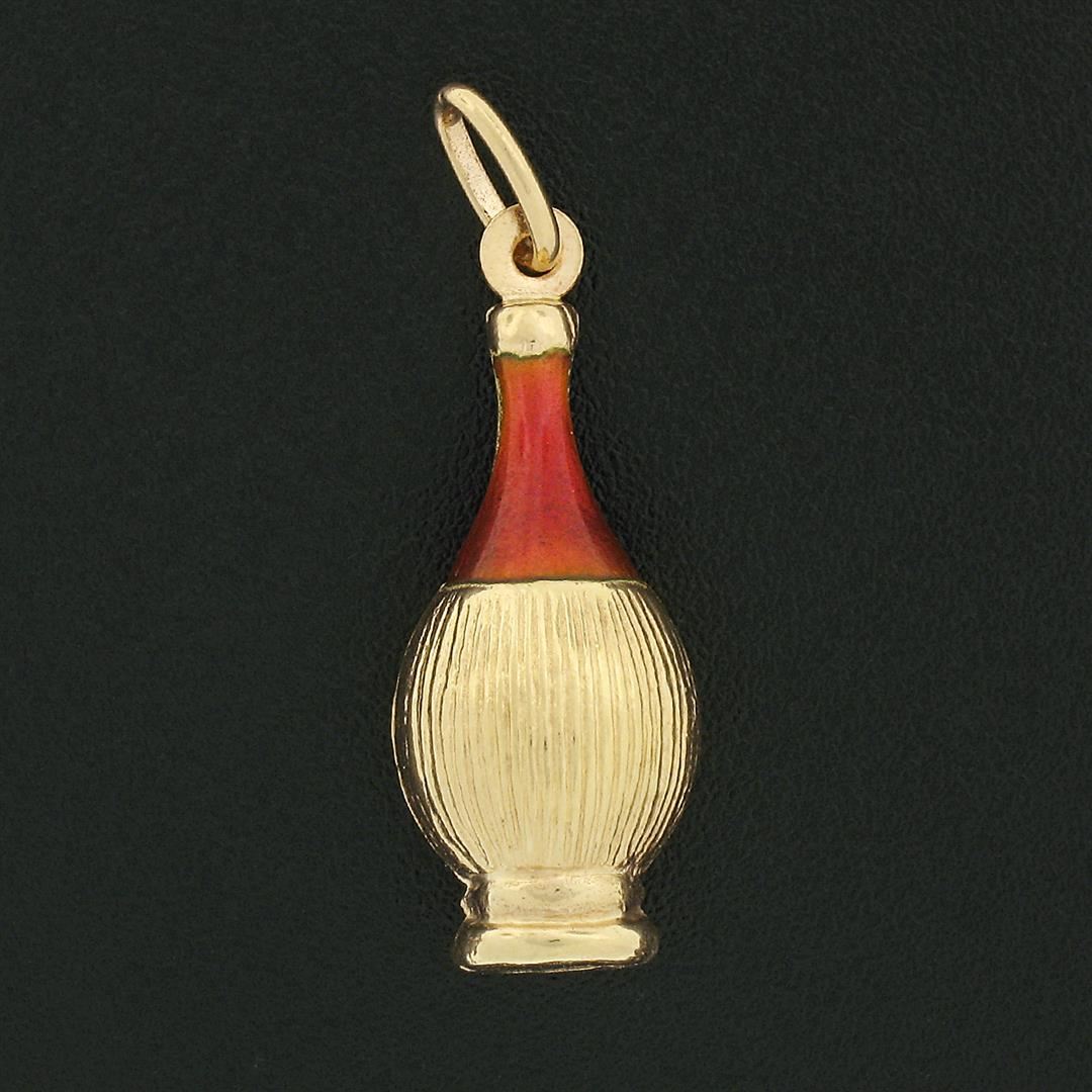A vintage solid 18k yellow gold canister jug charm pendant, with red enamel work. The pendant weighs a total of 2.52 grams, measures 30.4x9.85mm including the bail, and the inside of the bail measures 5.4x2.6mm.