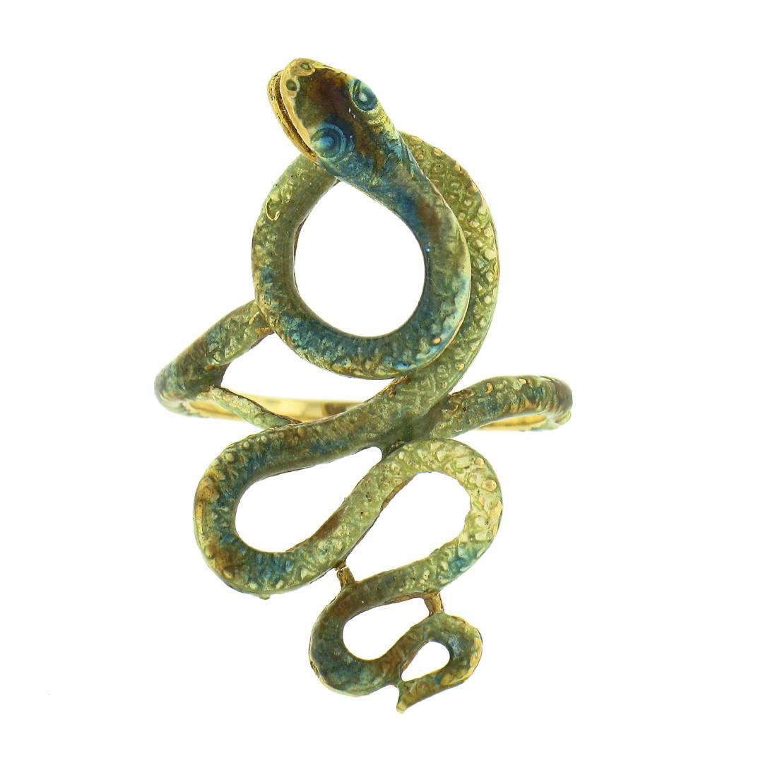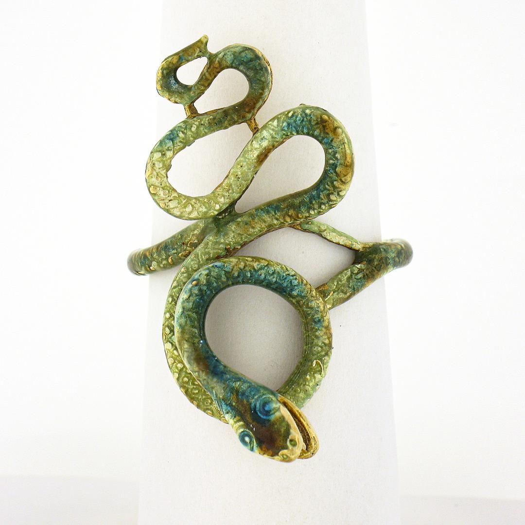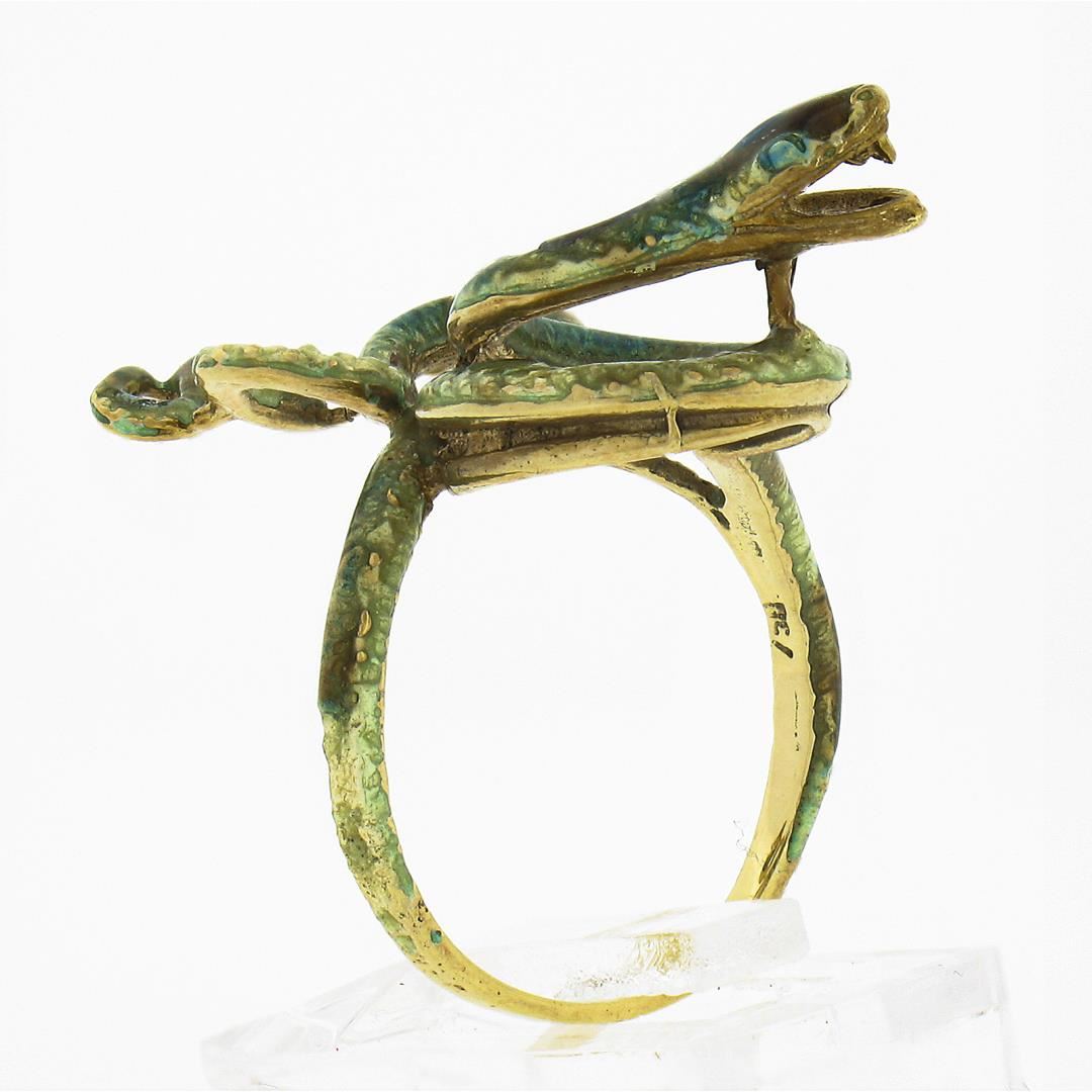 Vintage 18k Yellow Gold Colorful Green & Blue Enamel w/ Detailed Work Snake Ring