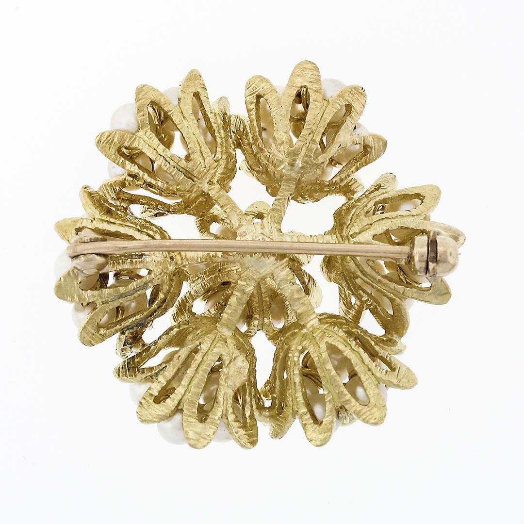 A vintage solid 18k yellow gold cluster brooch, with 35 of round shape cultured pearls (3mm each). Measures 26.5x28mm and weighs a total of 9.21 grams.