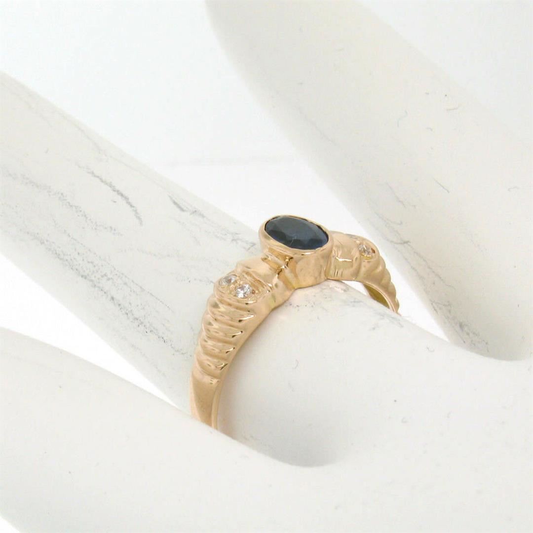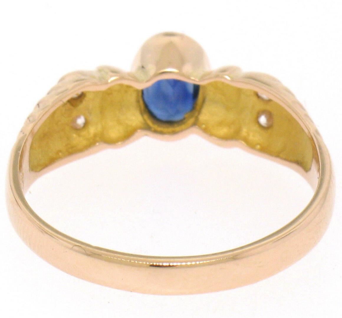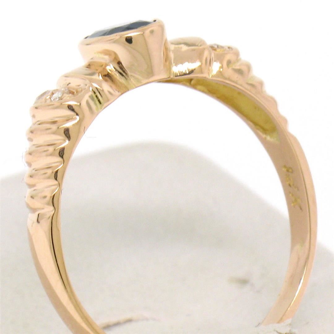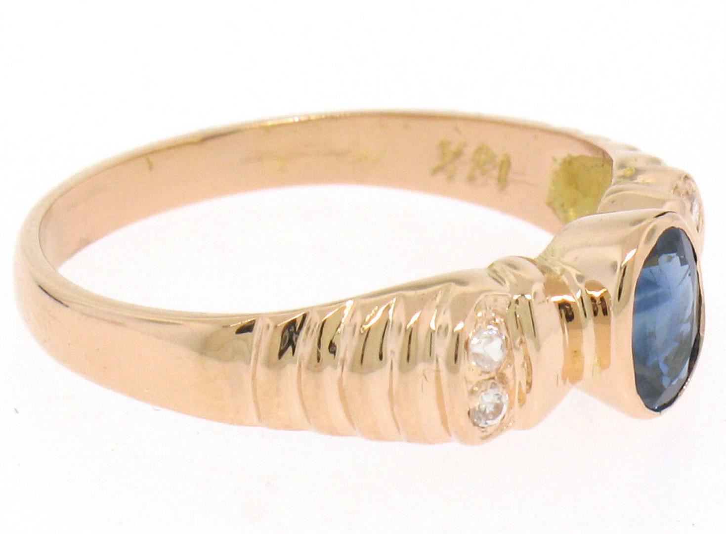 A vintage 18kt rose gold ring featuring a 0.60ct bezel set oval sapphire flanked by 4 round brilliant diamonds (G - VS2). The ring is size 6.0, weighs a total of 2.80 grams, and measures 6.33mm wide.