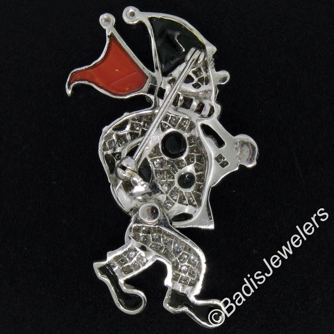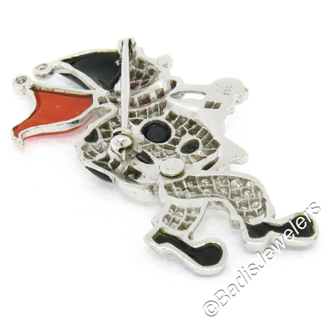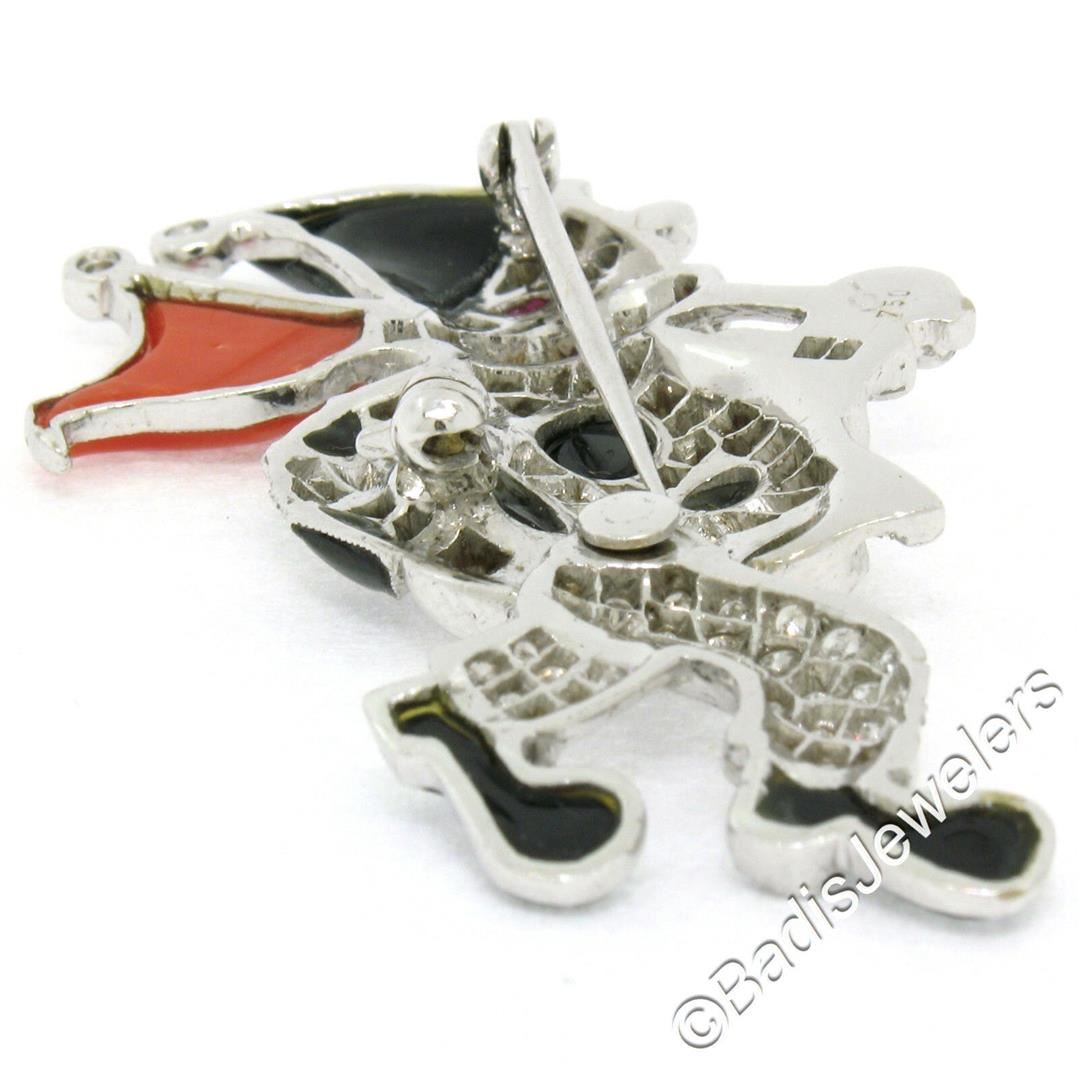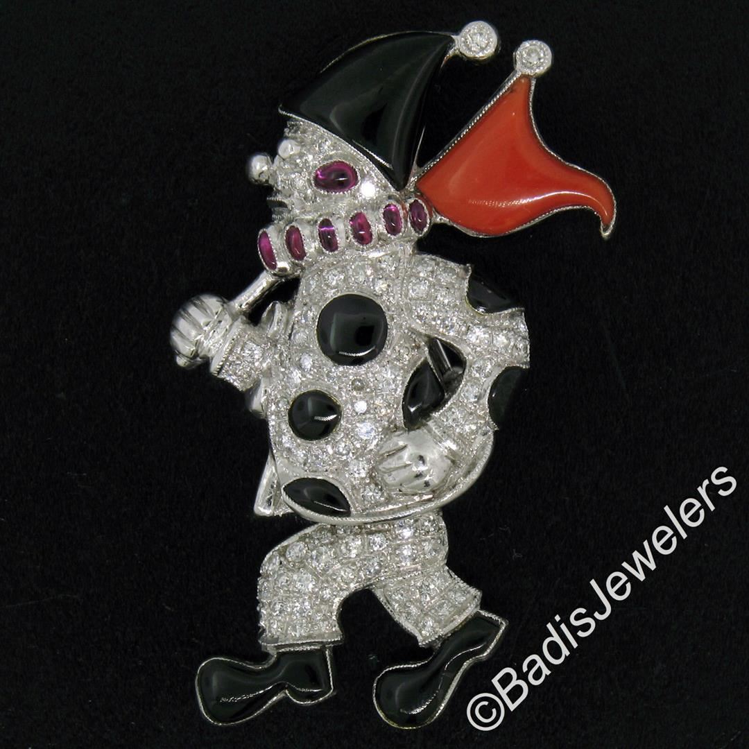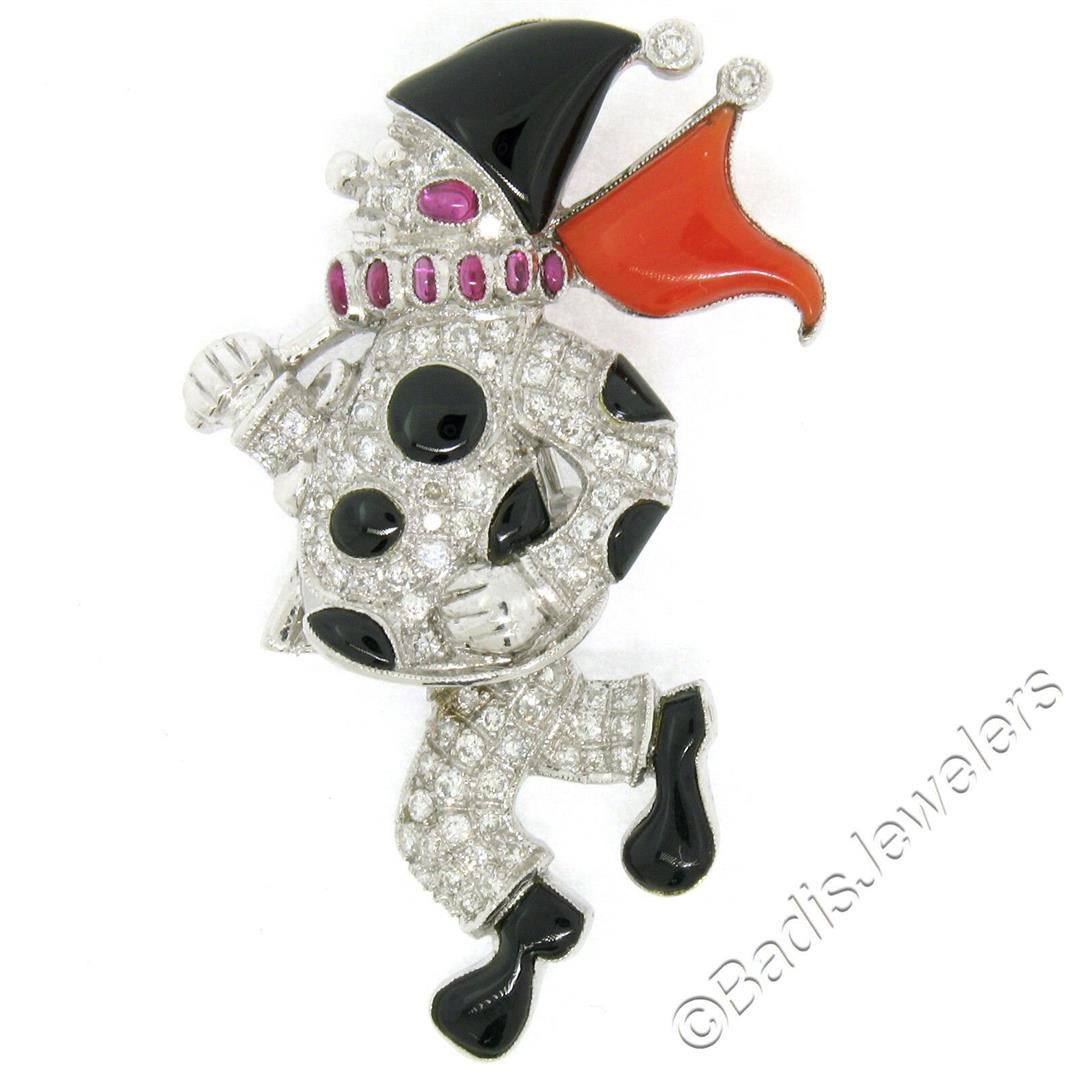 An excellent condition vintage 18kt white gold mobile clown brooch pave set with 1.50ctw of round diamonds (G/H - VS1), a custom cut coral, and several custom cut black onyx. Measures 47.55x32.80mm and weighs a total of 13.92 grams.