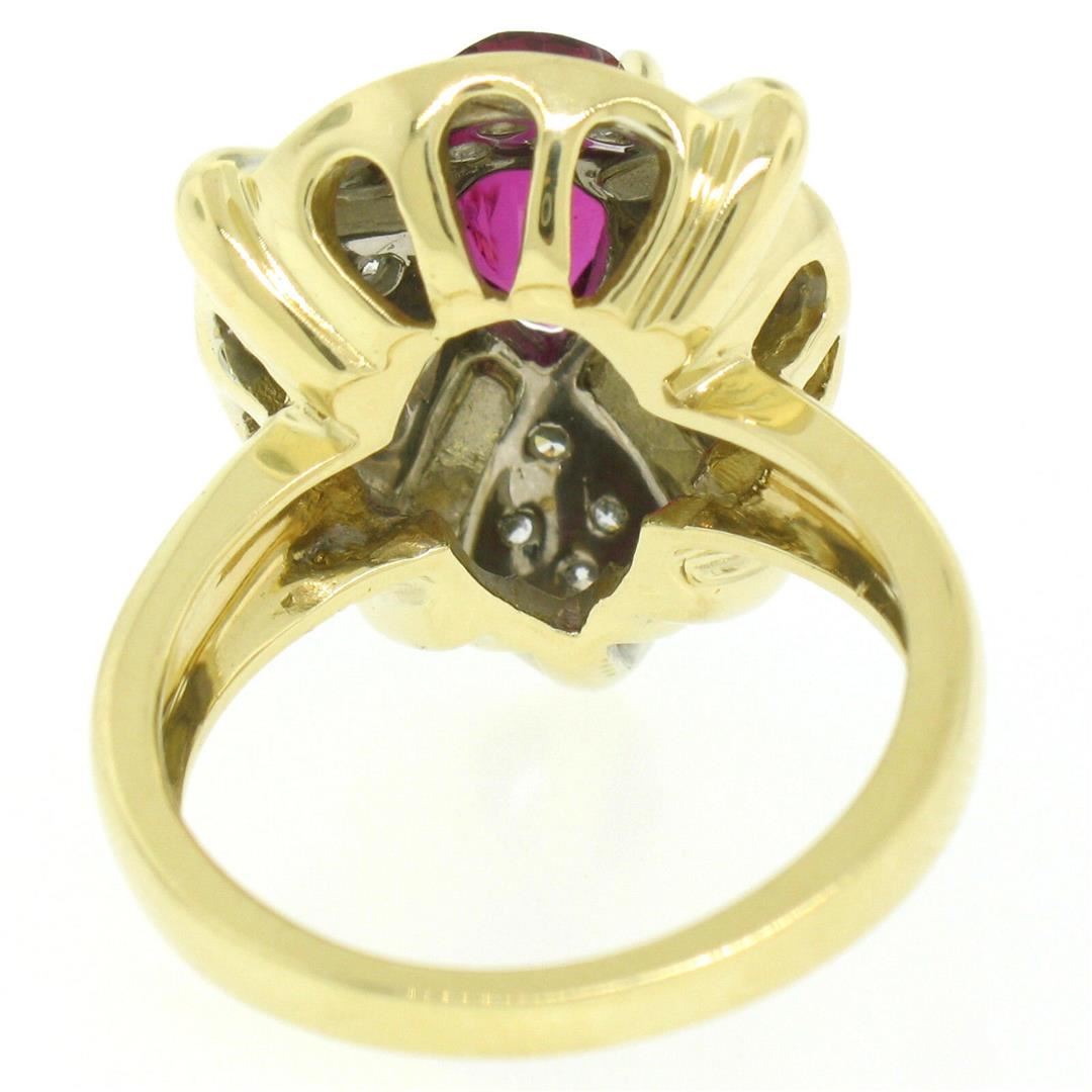 A vintage 18kt yellow and white gold cocktail ring featuring a 2.20ct pear cut ruby surrounded by 0.78ctw of round brilliant diamonds (G/H - VS2/SI1). The ring is size 7.0, weighs a total of 11.61 grams, and measures 20.90mm wide.