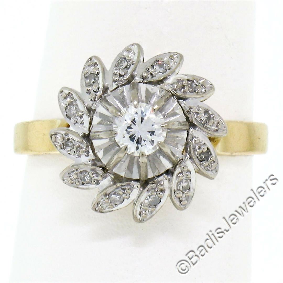 A vintage 18kt yellow and white gold flower cluster ring with a 0.20ct round transitional cut diamond (E - VVS2) solitaire surrounded by 0.18ctw of round single cut diamonds (F/G - VS2). The ring is size 7.5, weighs a total of 3.76 grams, and measures 13.35mm wide.