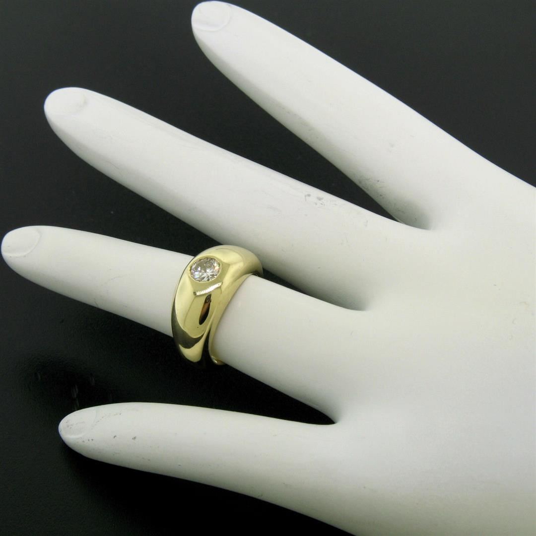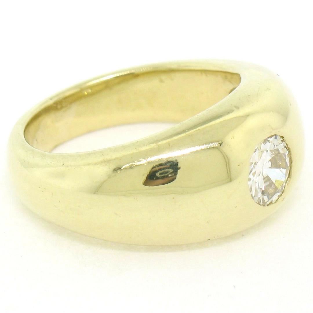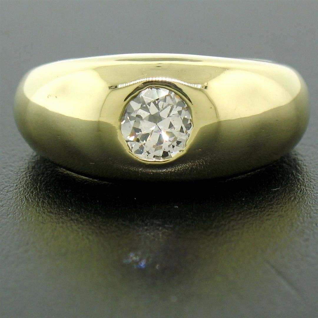 A vintage 18kt yellow gold band ring featuring a 0.45ct European cut diamond (H - VS1) burnish set at its center. The ring is size 3.0, weighs a total of 7.62 grams, and measures 8.30mm wide.