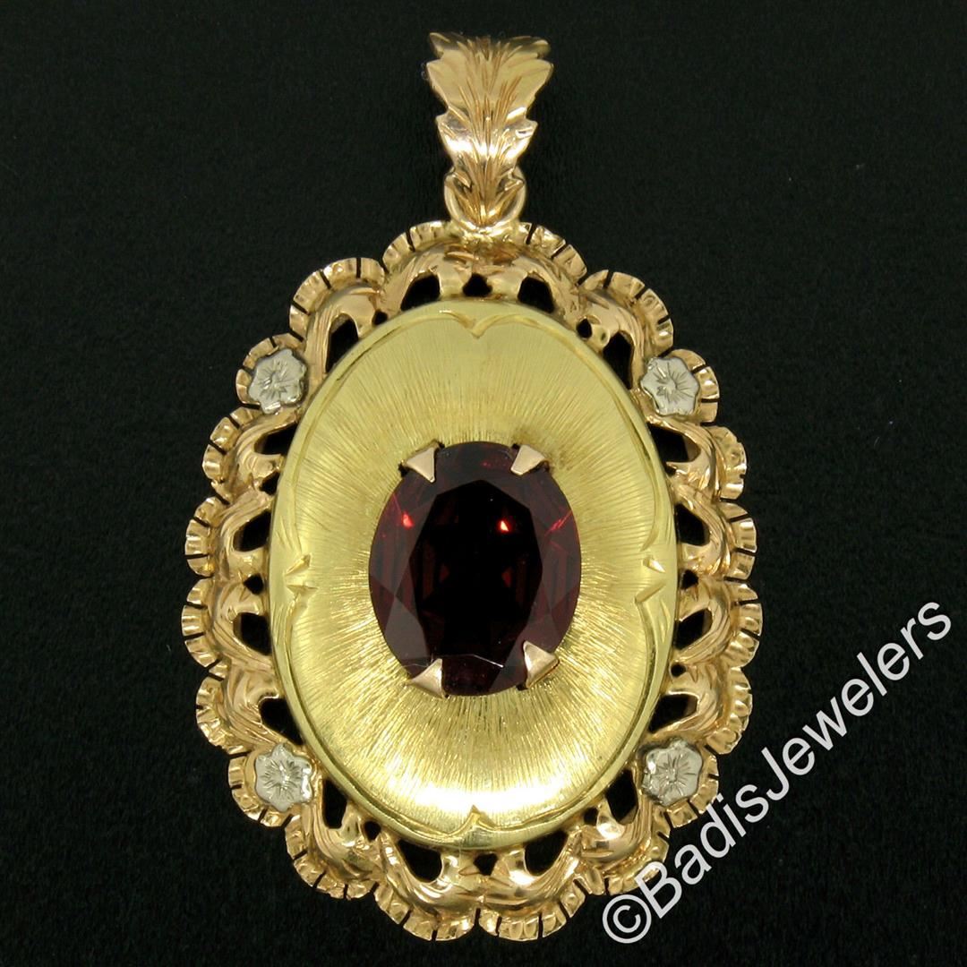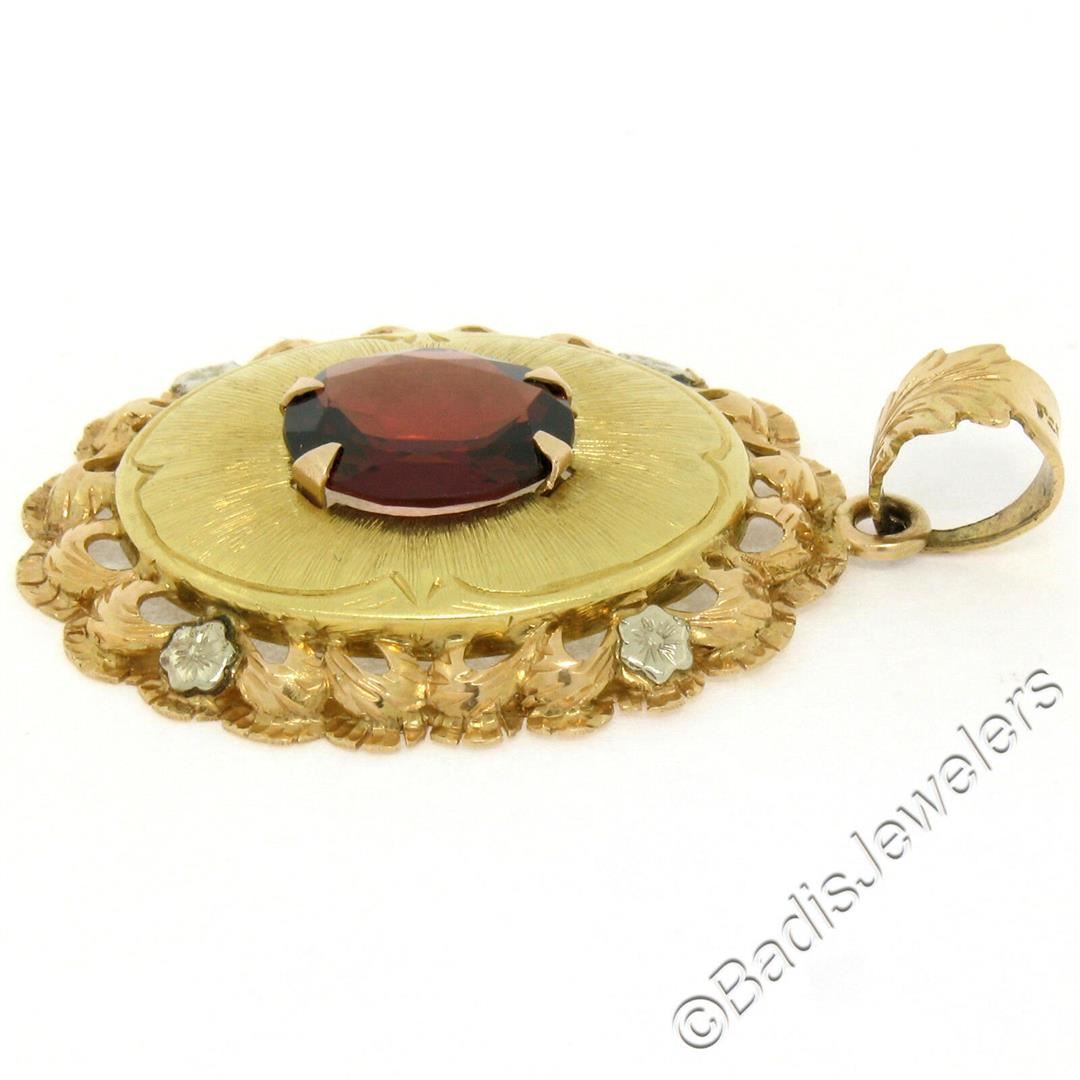 An excellent condition vintage 18kt gold pendant with a 3.42ct oval cut garnet prong set over a yellow gold centerpiece that is surrounded by an open rose gold frame which is accented by four white gold flowers. The pendant weighs a total of 6.47 grams, measures 44.95x27.50mm including the bail, and the inside of the bail measures 7.8x6.3mm.