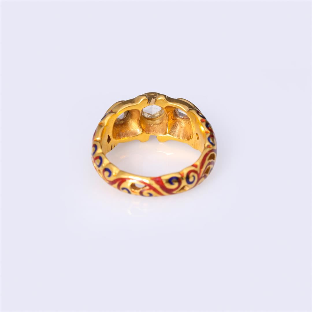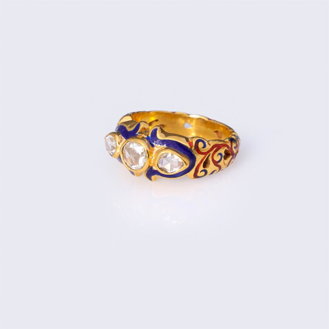 A vintage 22k yellow gold and diamond ring; bezel set with a larger central rose cut diamond measuring approximately .25 carats, flanked to each side with two pear shaped diamonds, surrounded on top with bright blue enamel borders, the gold band deeply en