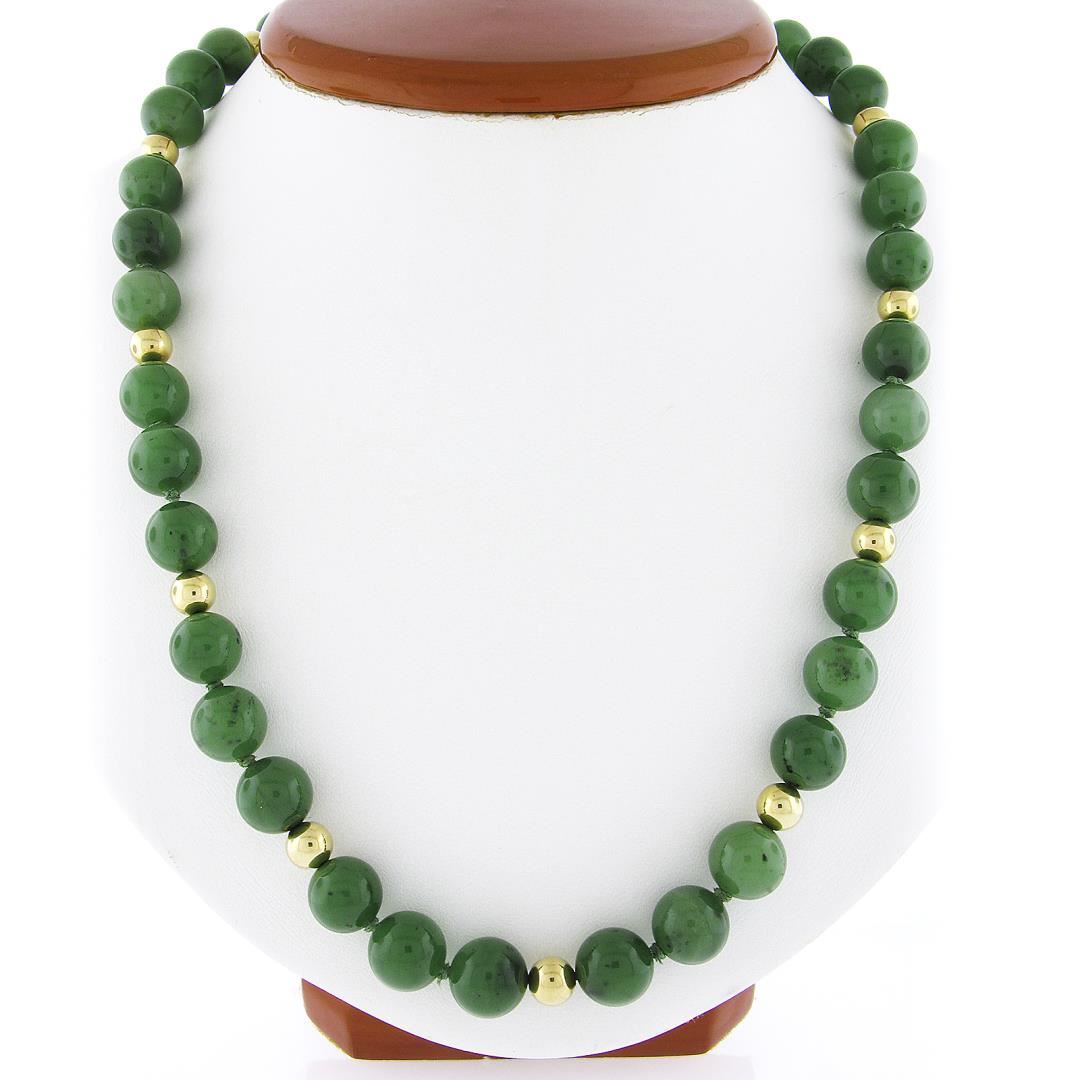A vintage solid 14k yellow gold bead strand necklace, with 56 GIA graded round bead shape natural nephrite jade ((55) 9.77-10.3+mm each & (1) 5.1mm). It weighs a total of 95.50 grams, measures 10.3mm wide, and measures 29 inches in length. Comes with all original relevant certifications.
