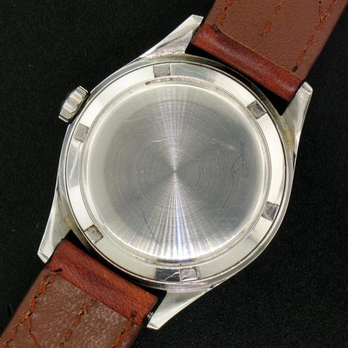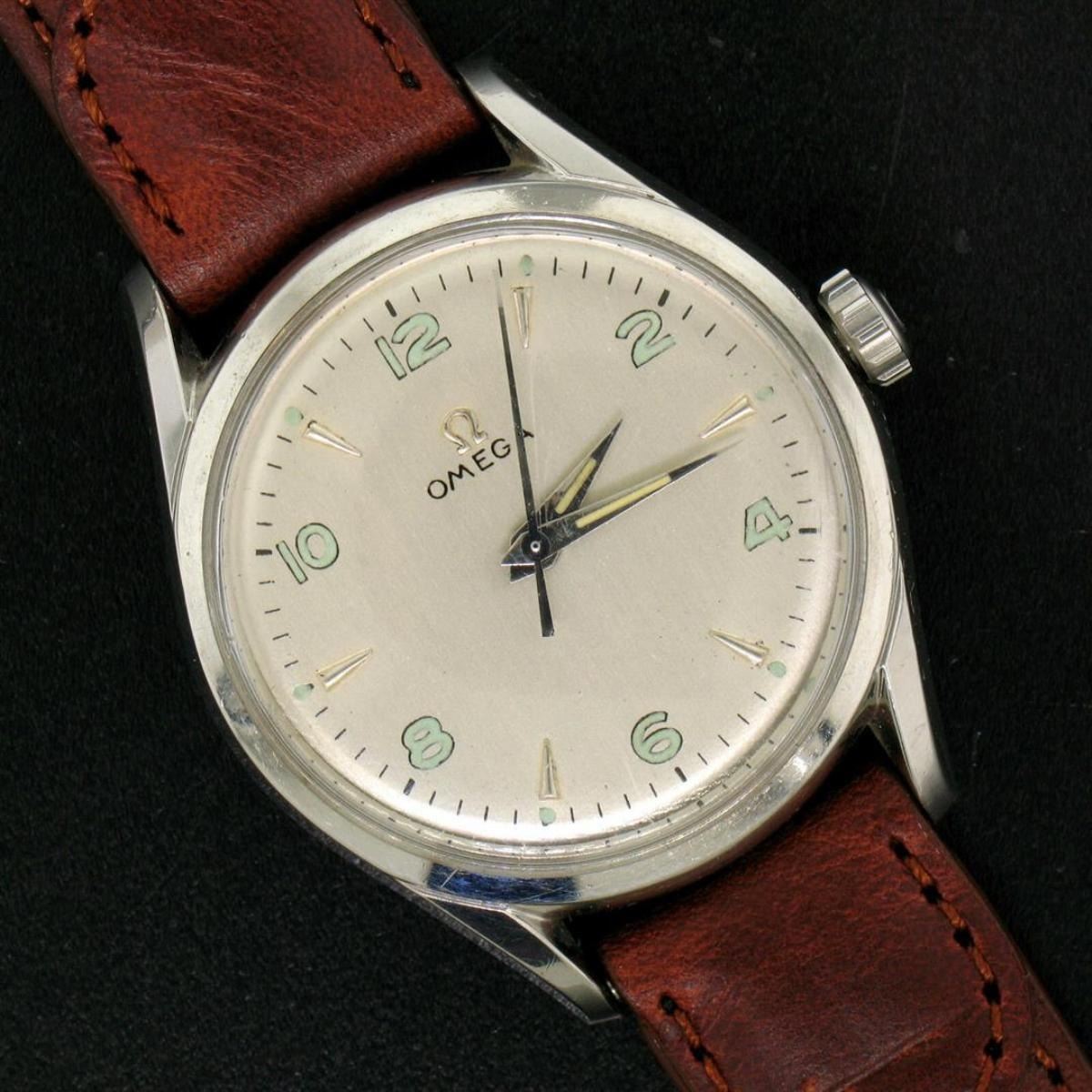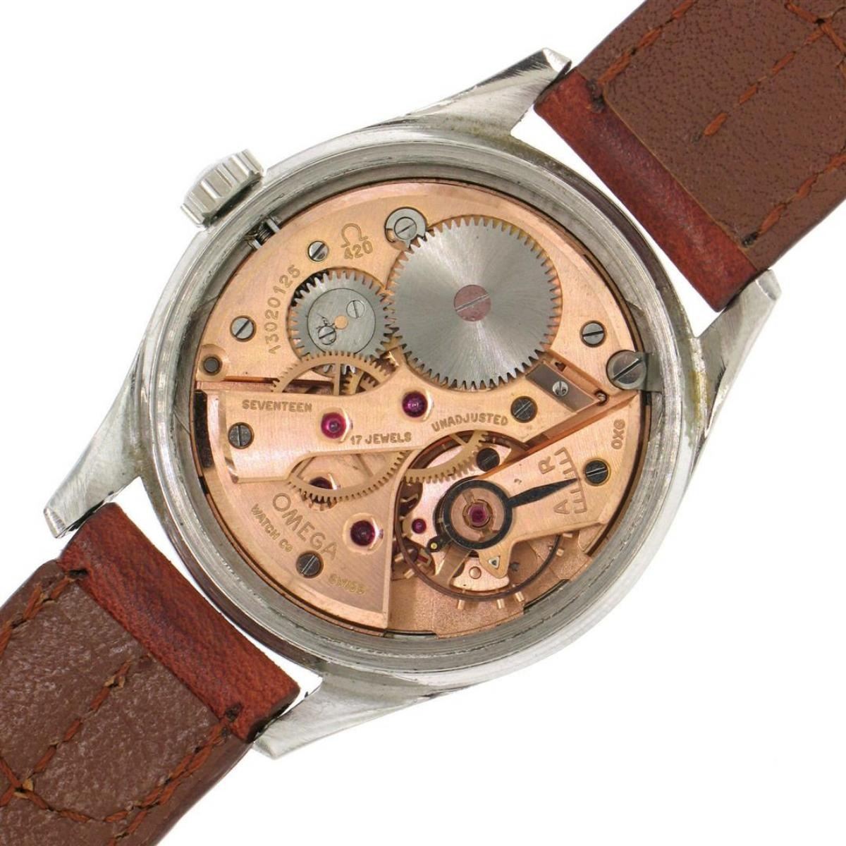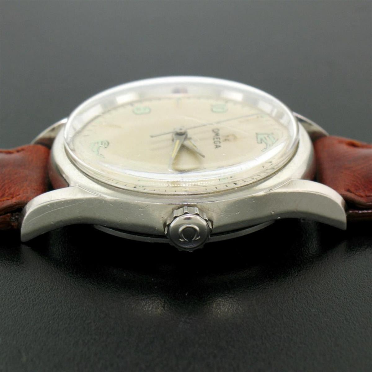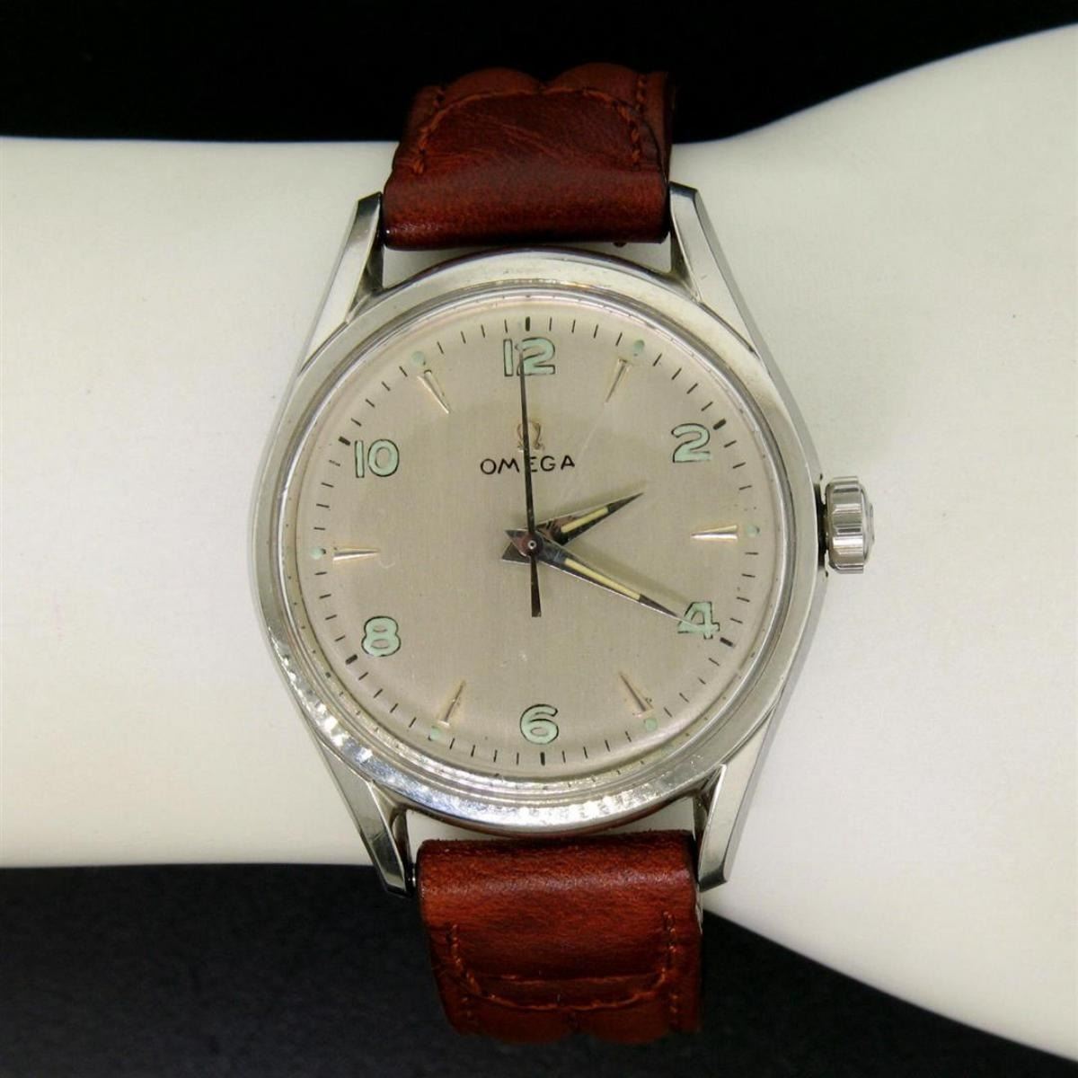 One Vintage 60's Men's Omega 32.5mm Stainless Steel 17 Jewel Mechanical Watch 2667-4. Item Details: Case Material: Stainless Steel, Height: 40.45mm (lug to lug), Width: 35.10mm (including the crown), Band Material: Genuine Leather - Brown, Band Length: (Adjustable) Fits up to 7.5 inch wrist, Band Width: 16mm, Watchmaker: Omega, Movement: Mechanical - Hand Winding - 17 Jewel - Unadjusted Weight: 39.3 Grams Condition: Light scratch from center to top of the crystal. Very few scratches on the back of the case. Overall excellent physical condition! Perfectly running movement!