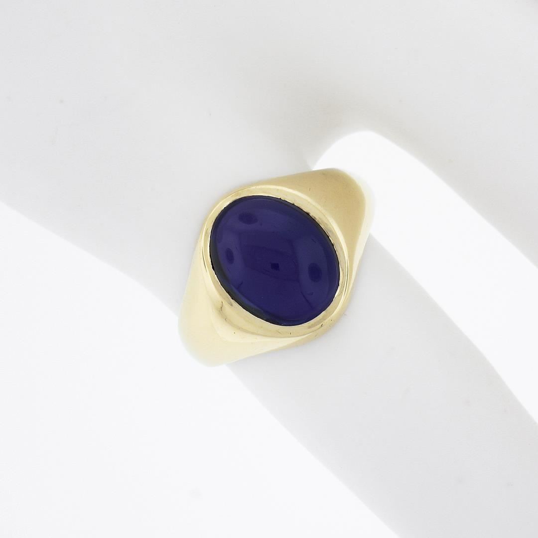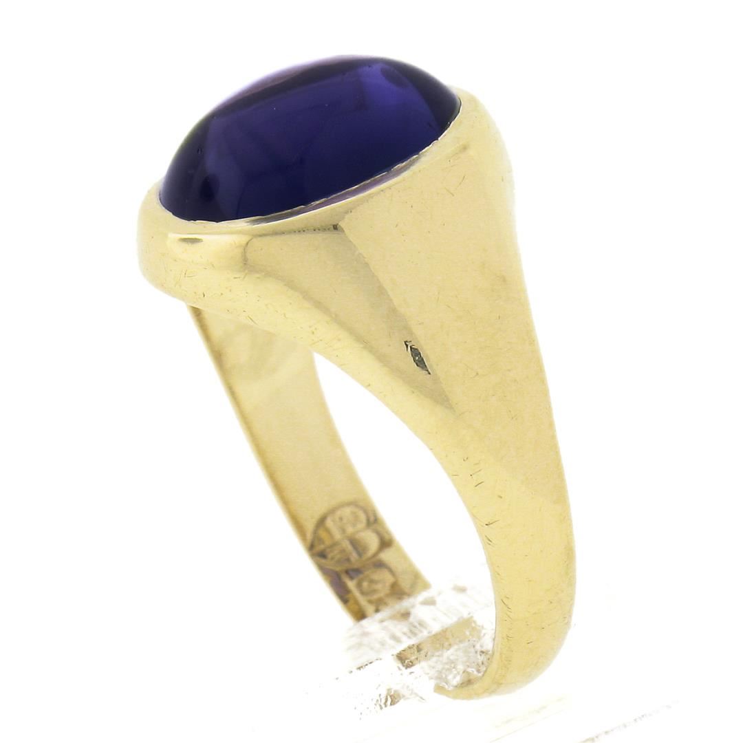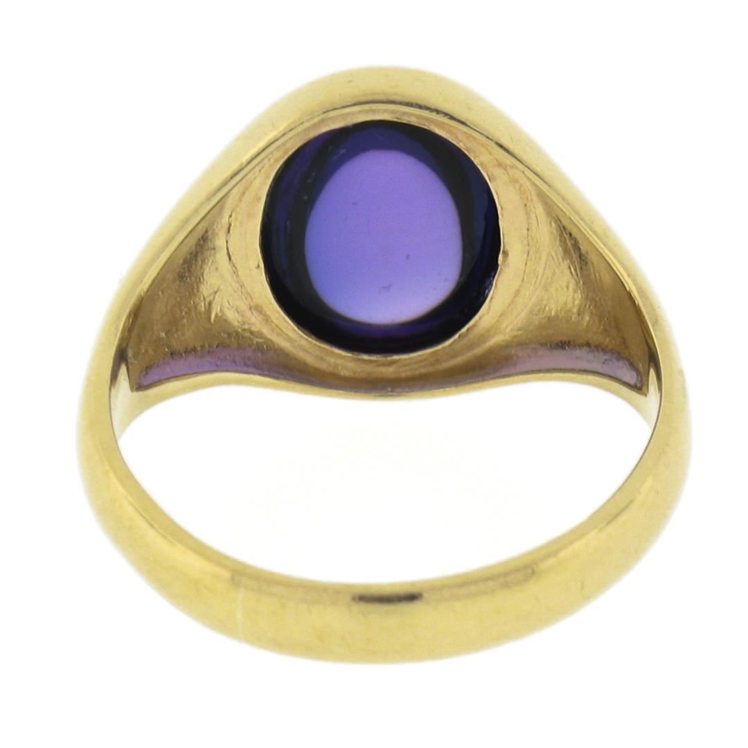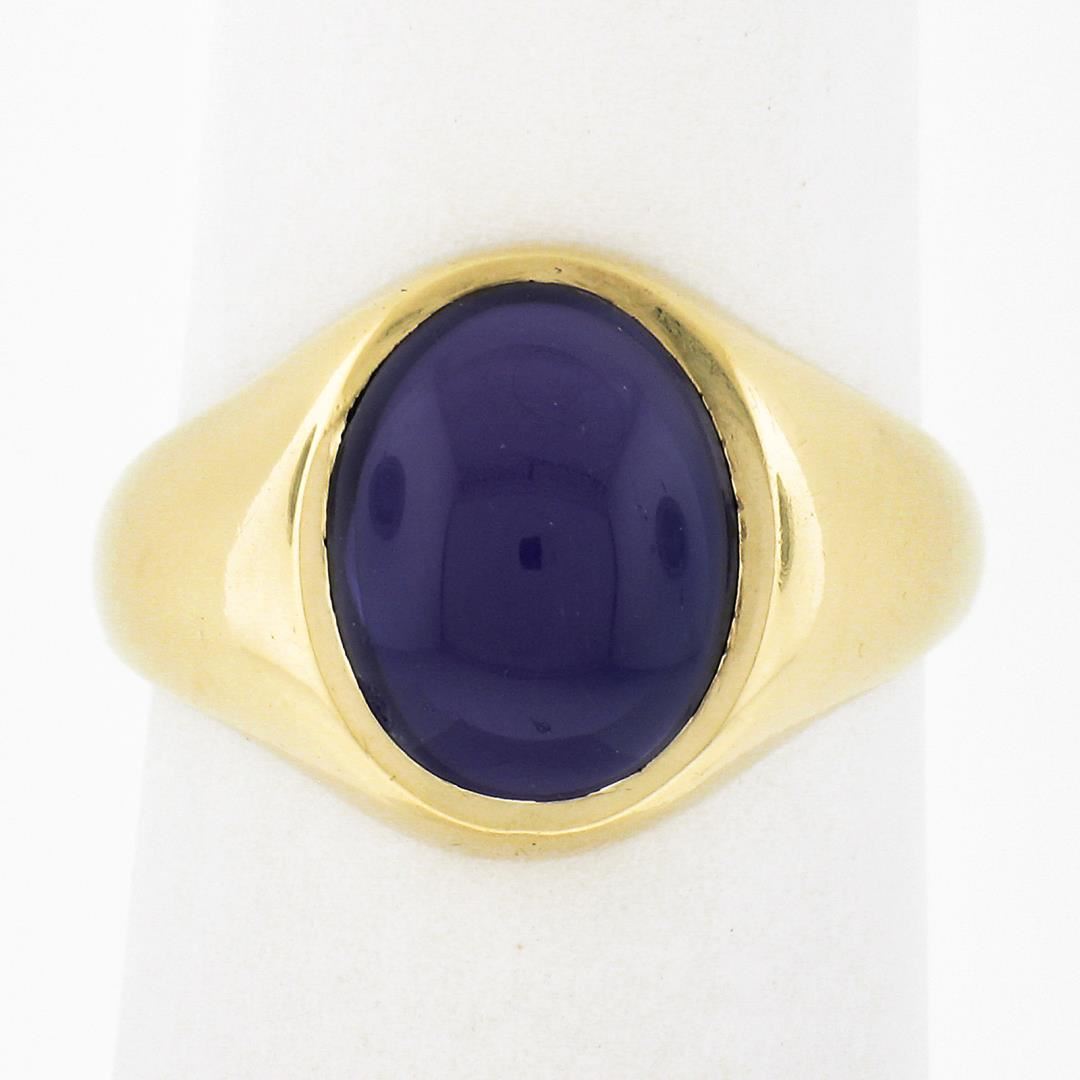 A vintage solid 9k yellow gold solitaire ring, with 1 oval cabochon cut natural amethyst (9.6x7.6mm). The ring is size 4.5, weighs a total of 2.82 grams, and measures 11.8mm wide.