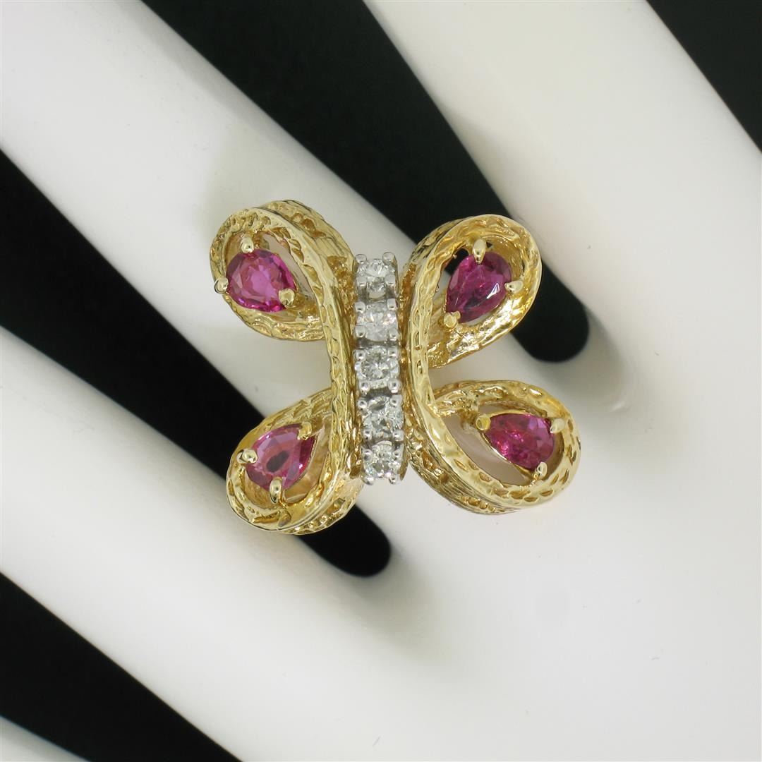 A vintage 14k yellow gold butterfly ring with 1.10ctw of pear cut rubies and 0.25ctw round diamonds (F - VS1). The ring is size 7.0, weighs a total of 8.36 grams, and measures 24.5mm wide.