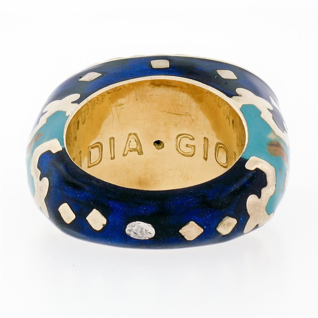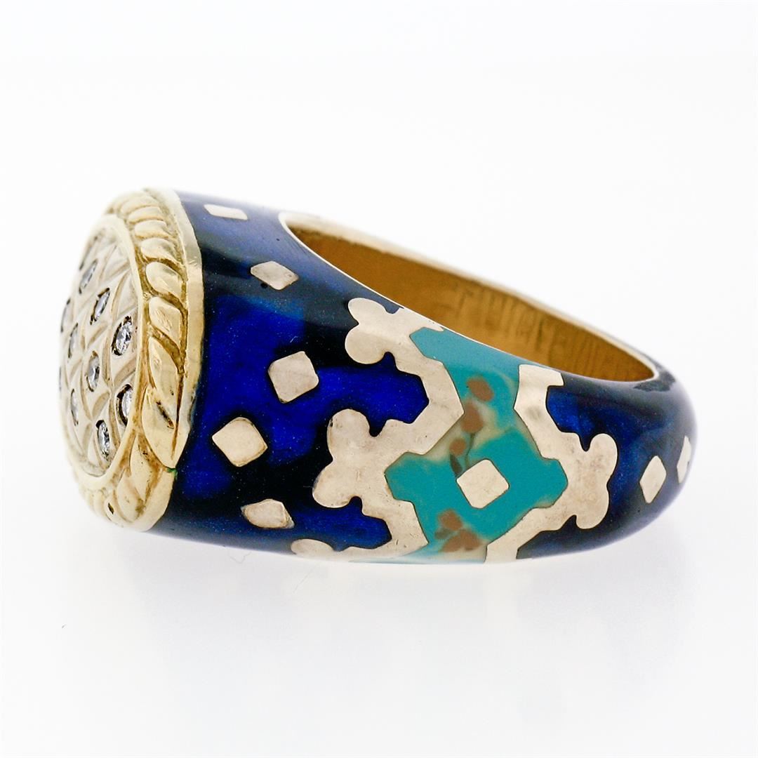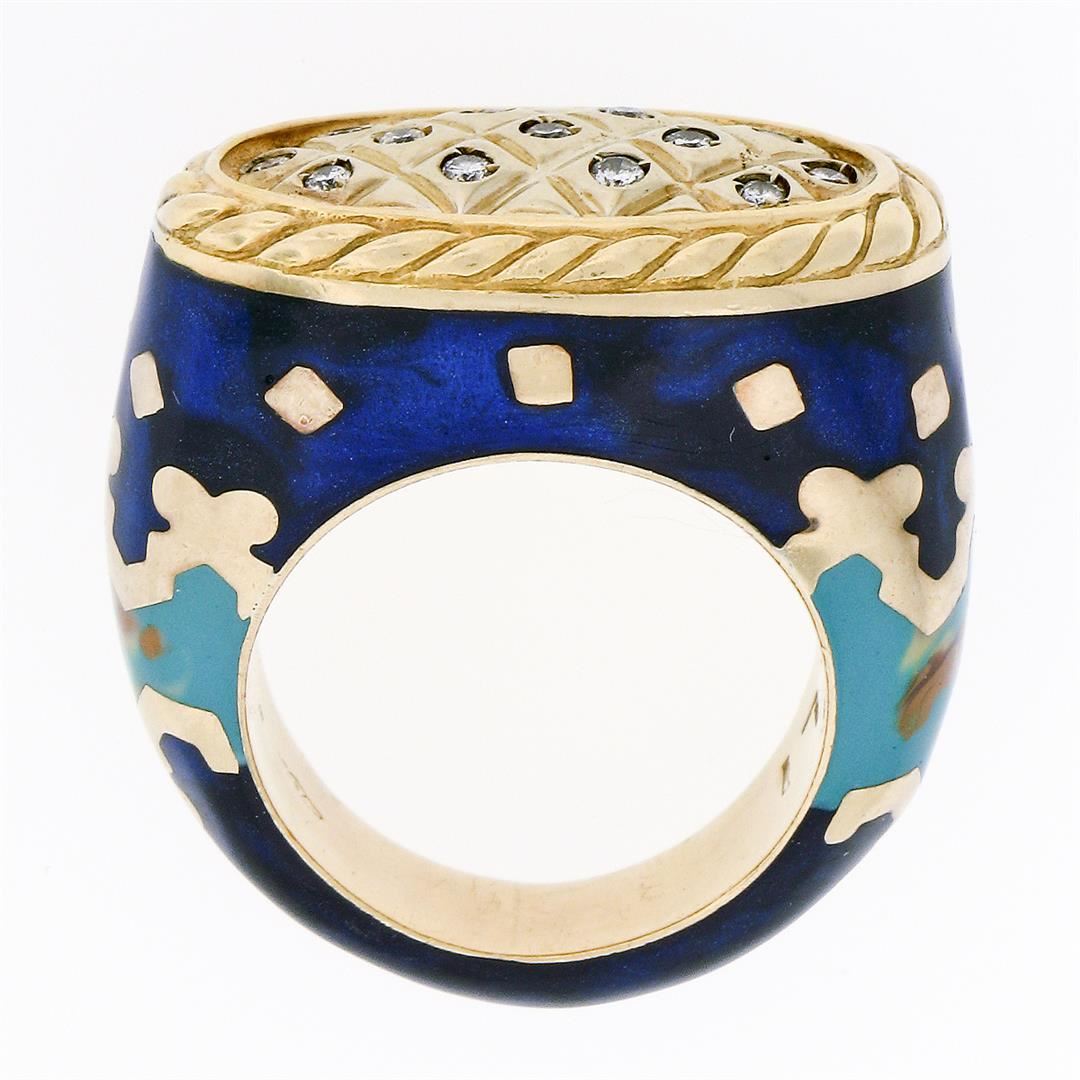A vintage solid 18k yellow gold with eneamel work cocktail ring by Fidia Gioiellli, featuring 13 round brilliant cut natural diamond (F- VS1; 0.20ctw ). The ring is size 5.0, weighs a total of 17.0 grams, and measures 22.3mm wide.