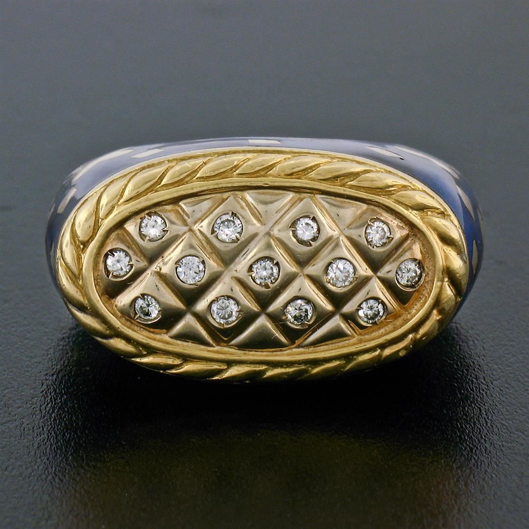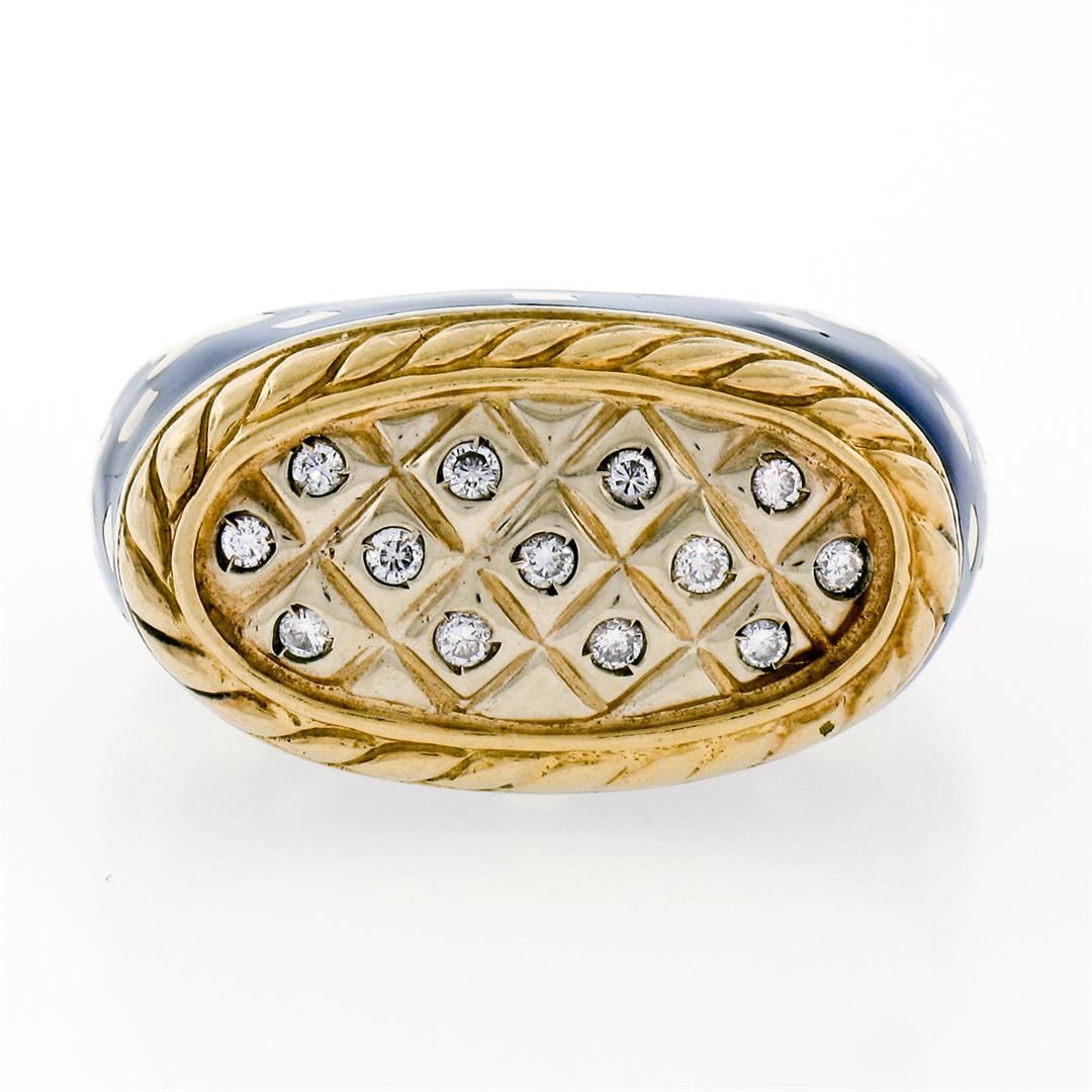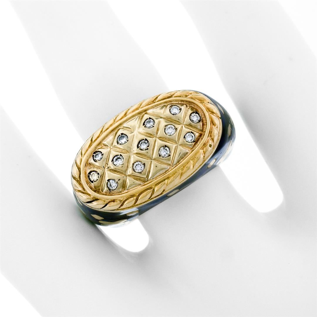 A vintage solid 18k yellow gold with eneamel work cocktail ring by Fidia Gioiellli, featuring 13 round brilliant cut natural diamond (F- VS1; 0.20ctw ). The ring is size 5.0, weighs a total of 17.0 grams, and measures 22.3mm wide.