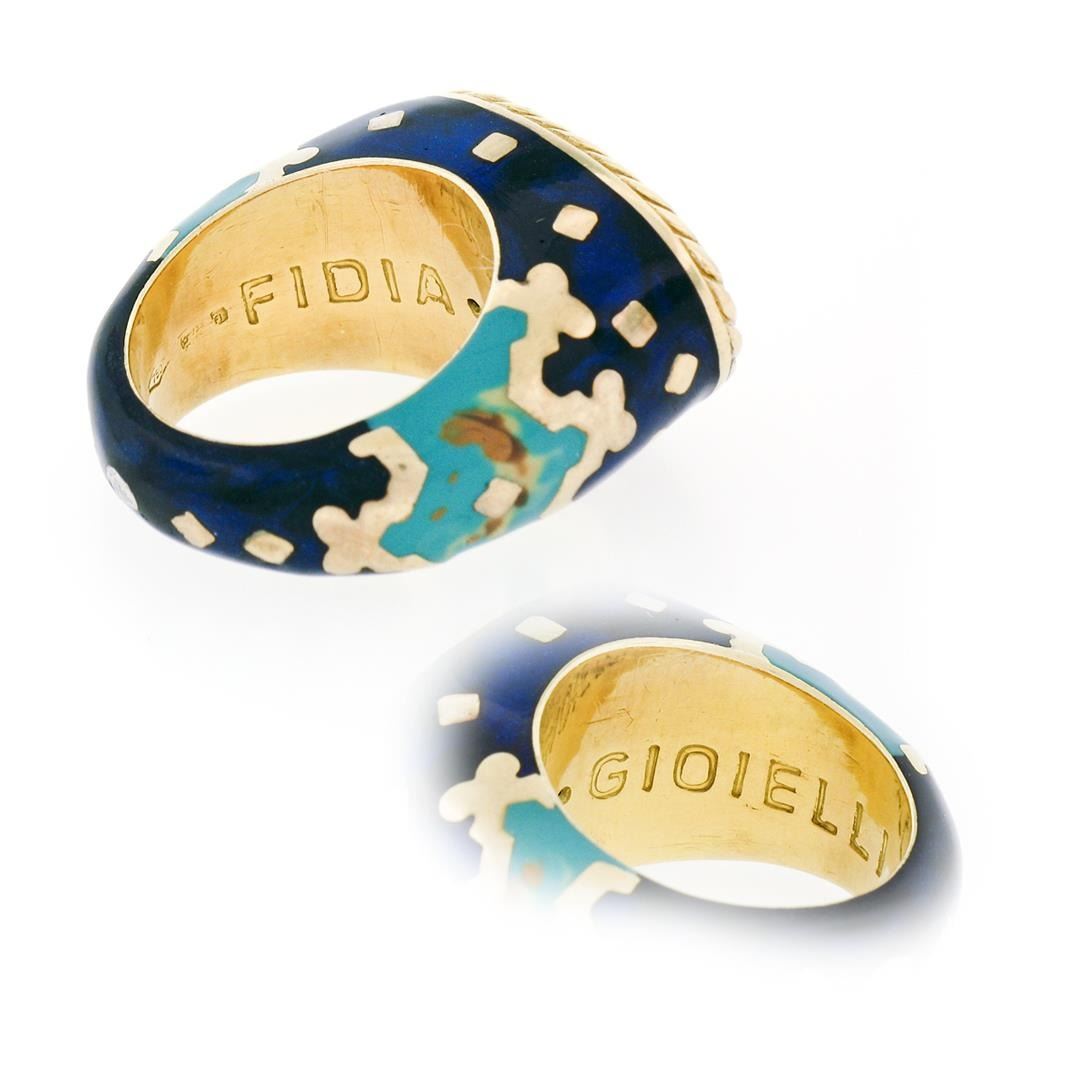 A vintage solid 18k yellow gold with eneamel work cocktail ring by Fidia Gioiellli, featuring 13 round brilliant cut natural diamond (F- VS1; 0.20ctw ). The ring is size 5.0, weighs a total of 17.0 grams, and measures 22.3mm wide.