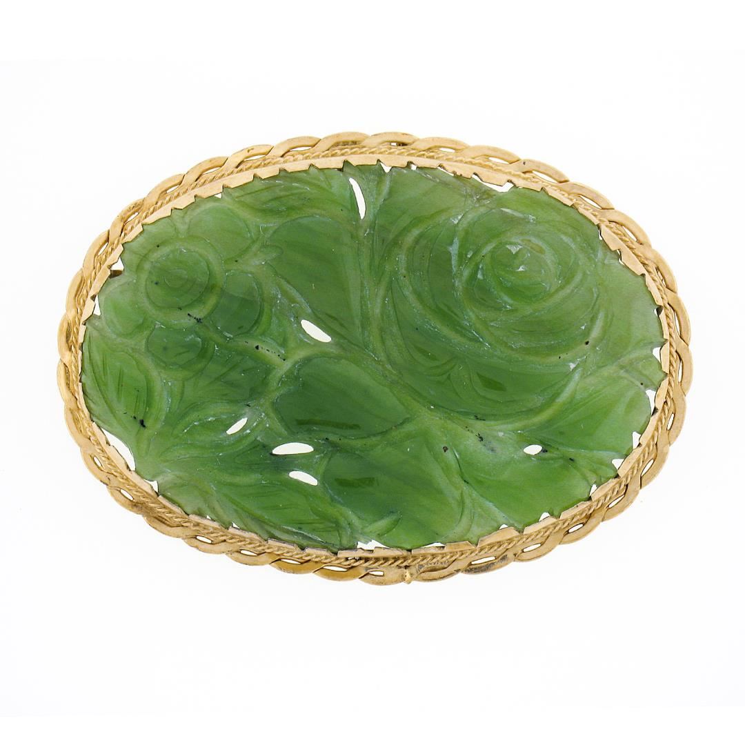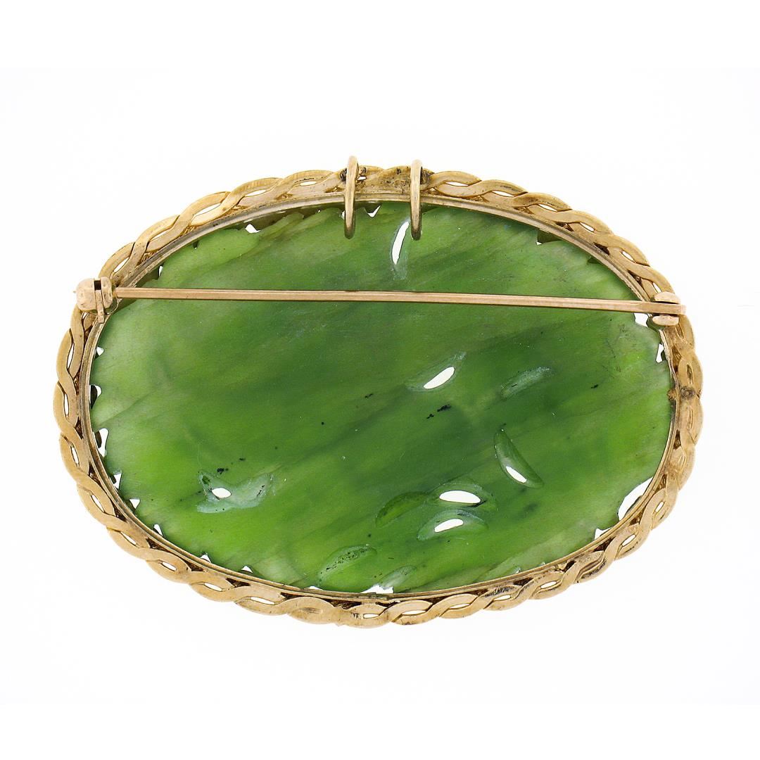 A vintage solid 12k yellow gold frame brooch pendant, with 1 carved natural jade (45.4x30mm). Measures 36x50.2mm and weighs a total of 12.79 grams, and bail diameter inside 4.7mm.