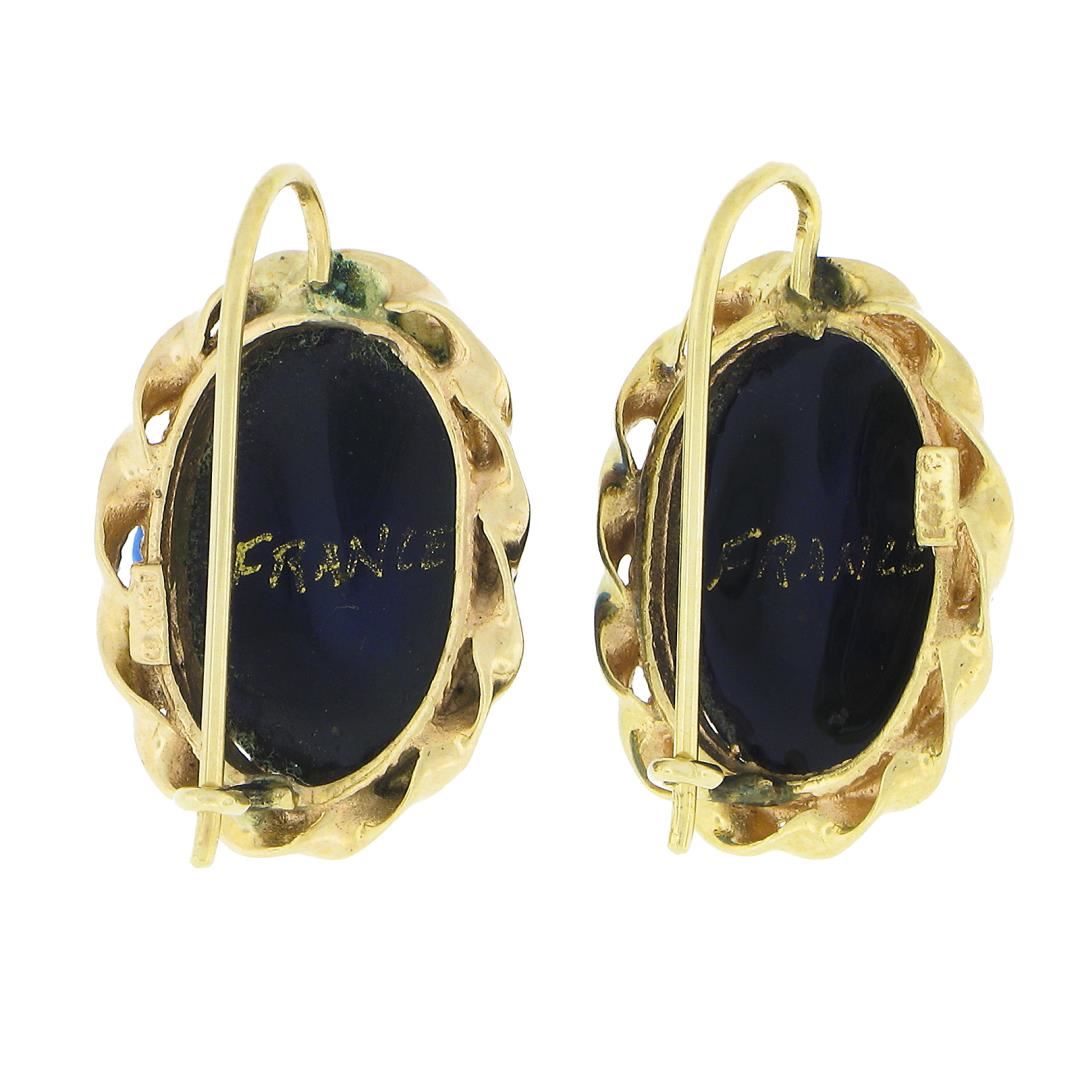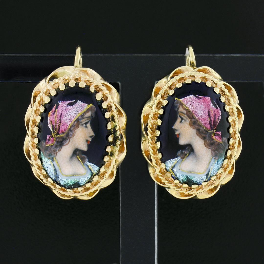 A vintage solid 14k yellow gold earrings, with 2 hand painted porcelain portrait. The earrings measure approximately 23.5x15.70mm and weigh a total of 5.81 grams.
