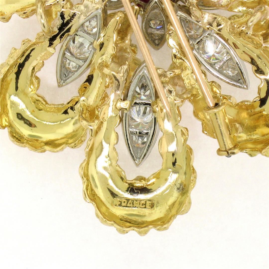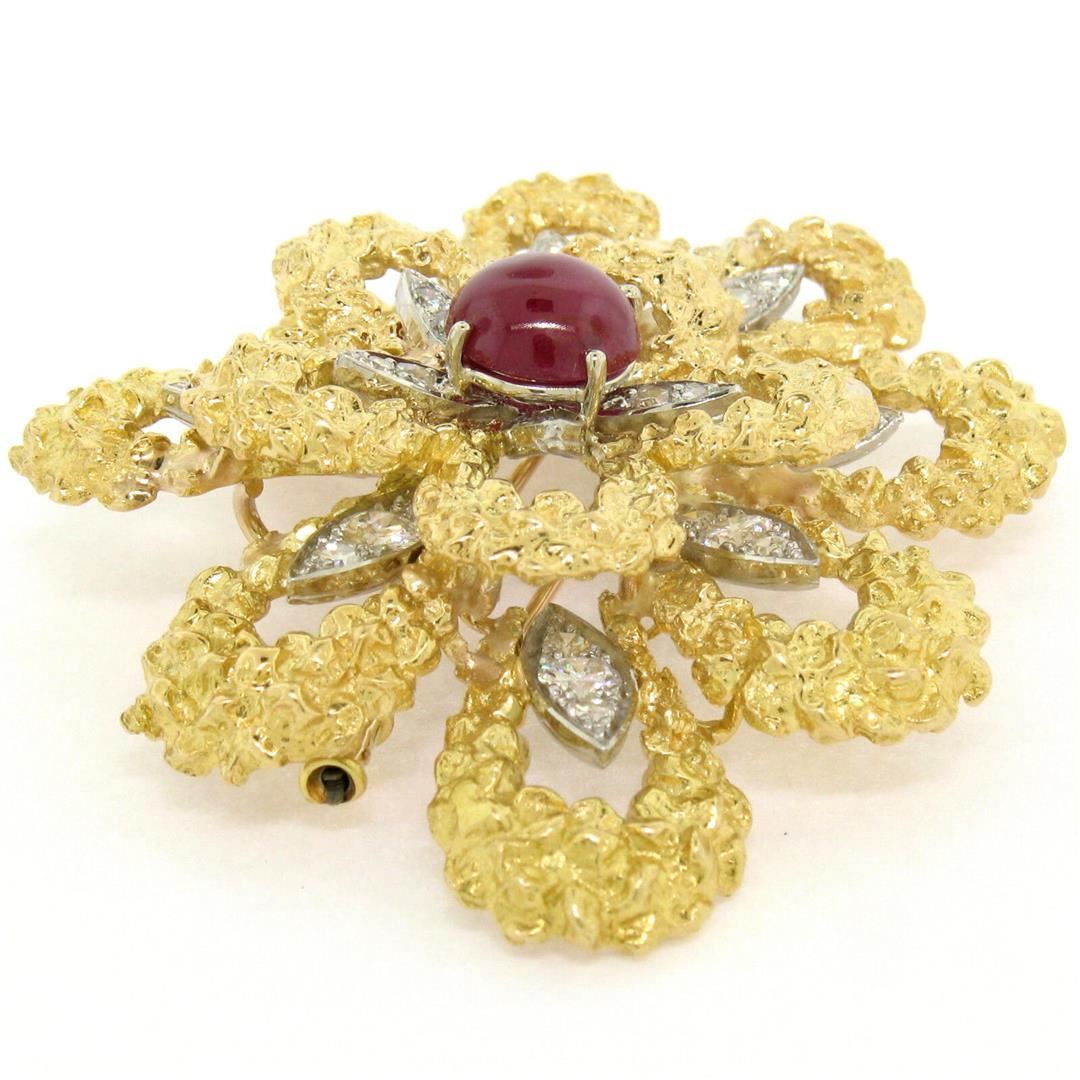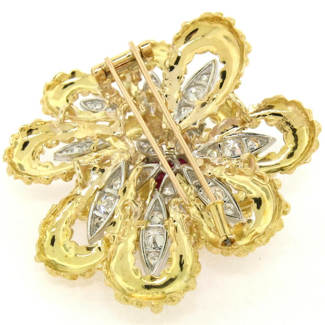 One Vintage French 18K TT Gold 4.27ctw Diamonds & Ruby Textured Burst Flower Brooch. Item Details: Material: 18K Solid Yellow and White Gold, Total Weight: 31.83 Grams, Stone(s): (1) Natural Genuine Ruby - Round Cabochon Cut - Prong Set - Deep Blood Red Color - 8.81x8.26mm / 2.87ct (approx.), (34) Natural Genuine Diamonds - Pavé Set - Round Single Cut - F Color - VVS2 Clarity - 1.40ctw (approx.), Total Carat Weight: 4.27 (approx.), Overall Height: 47.10mm, Overall Width: 51.60mm, Overall Thickness: 12.05mm (at its thickest, not including the pin) Condition: Vintage piece. Excellent condition!