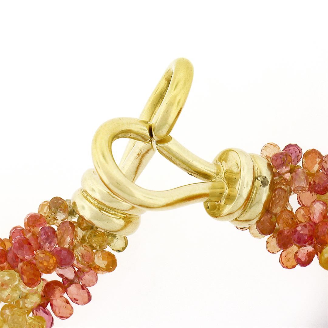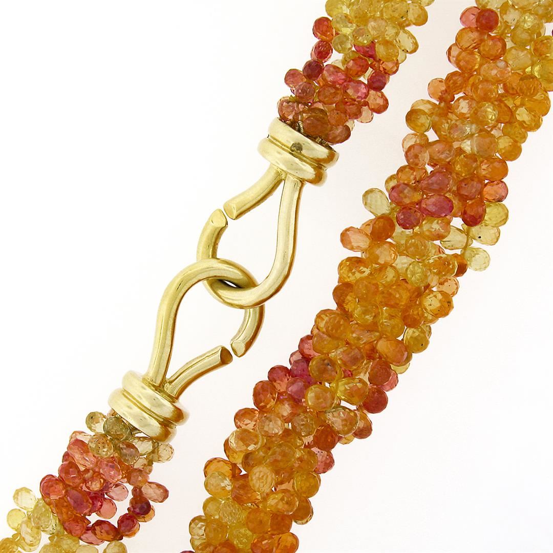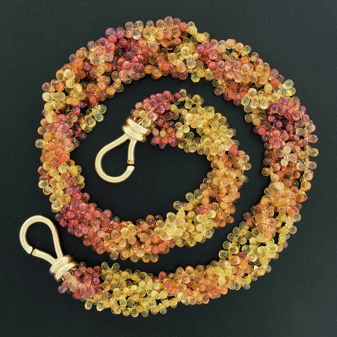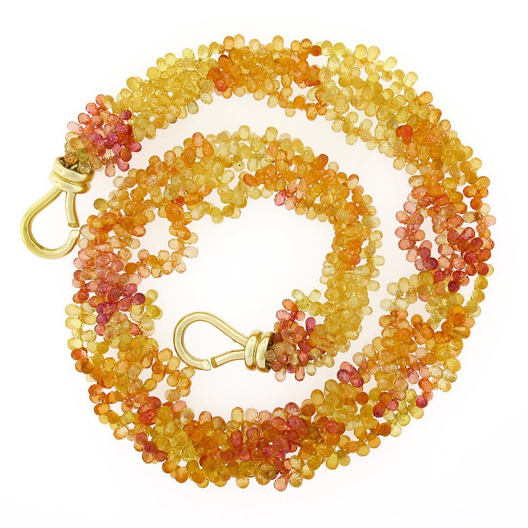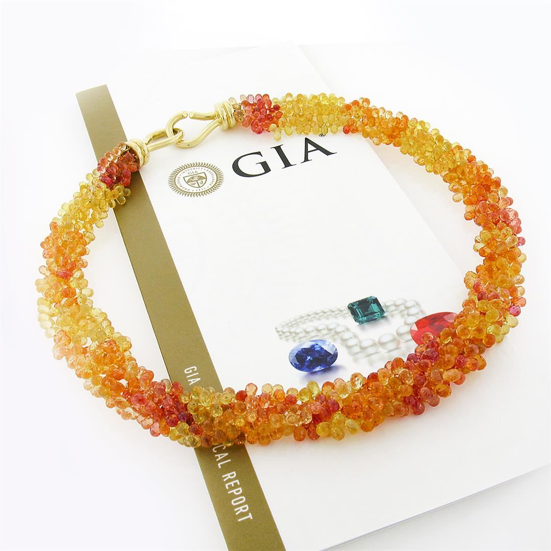 A vintage 4 strand necklace with 14k yellow gold clasp, featuring gia certified of numerous briolette cut natural yellow sapphires. 19 inch strand link chain, 104.70 grams total weight, clasp width measures 15.0mm. Comes with all original relevant certifications.