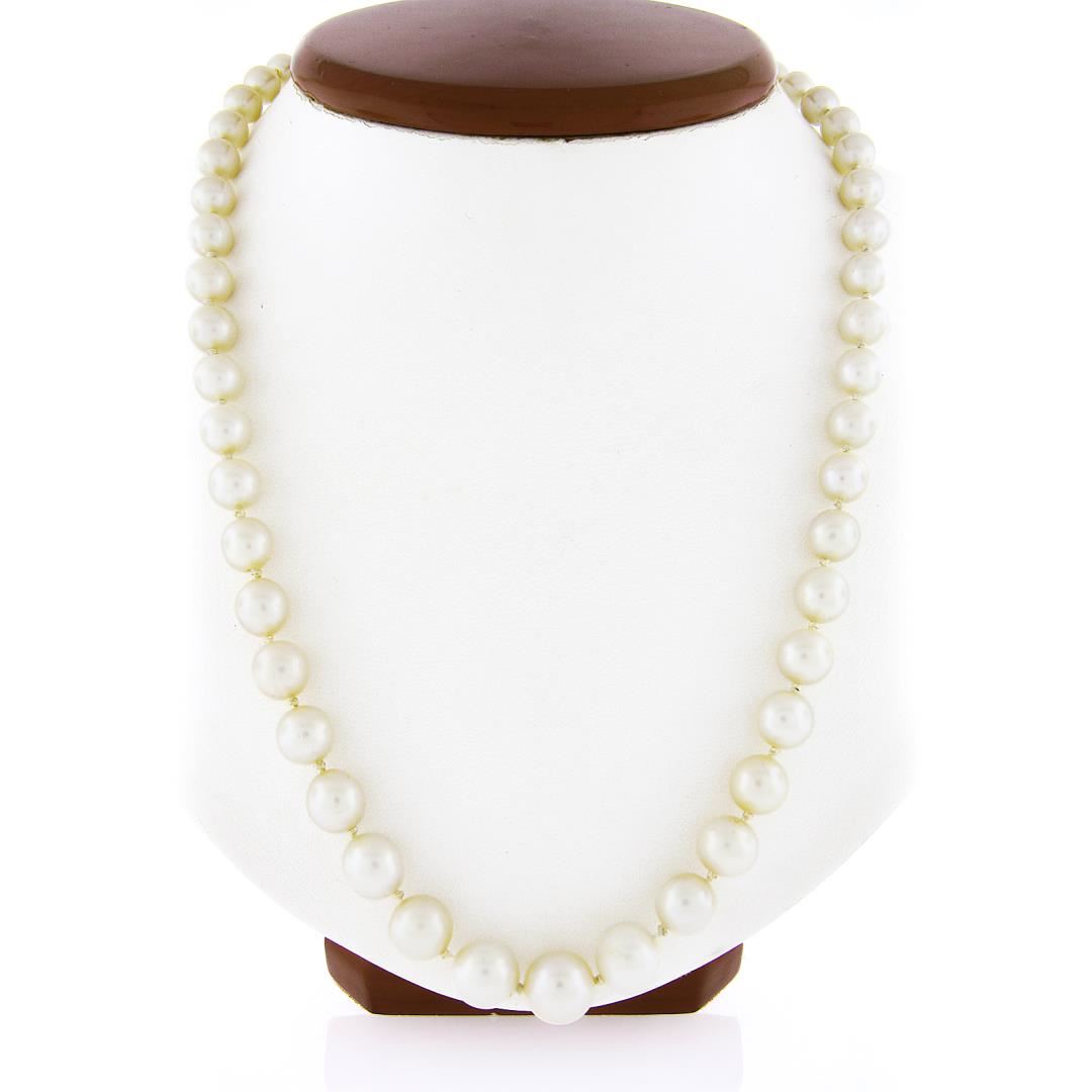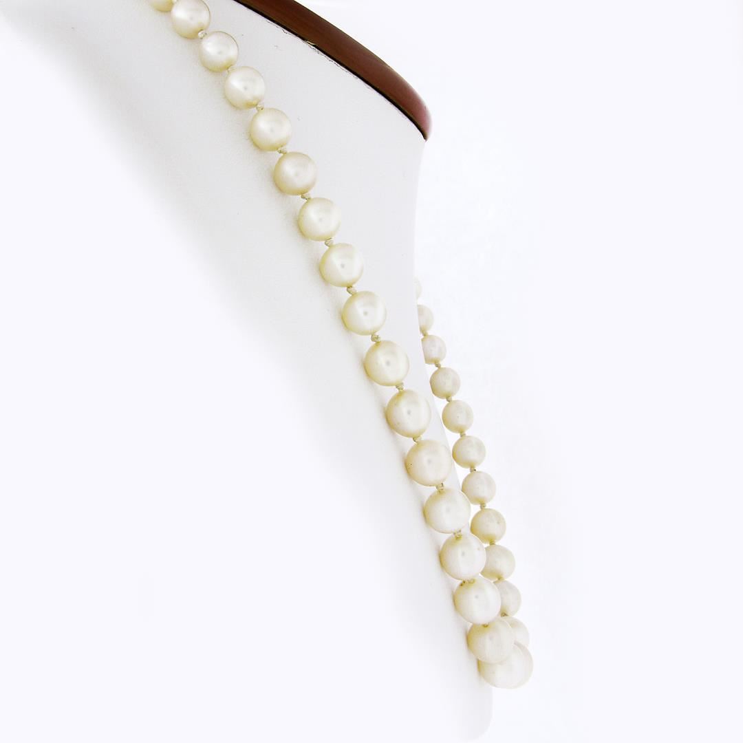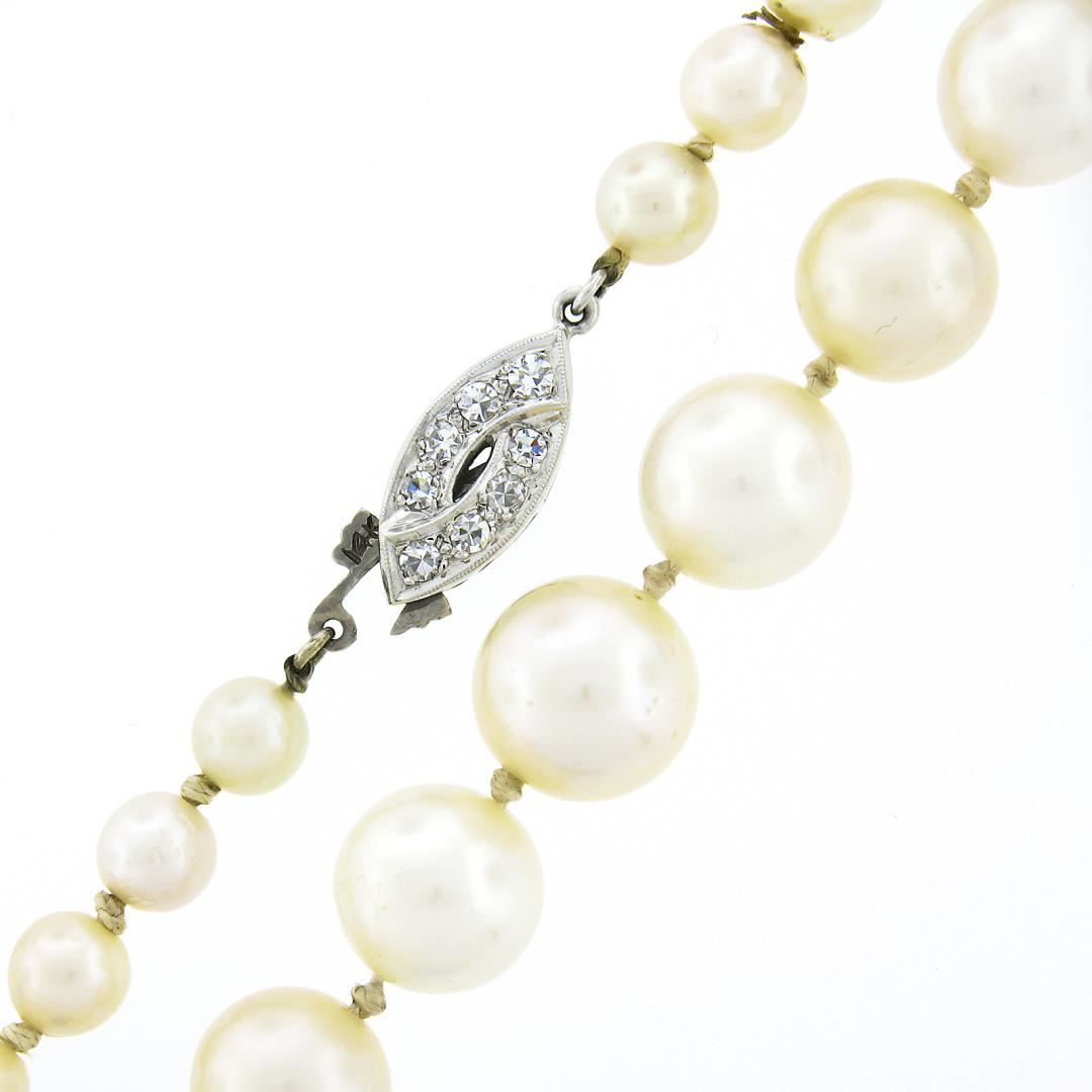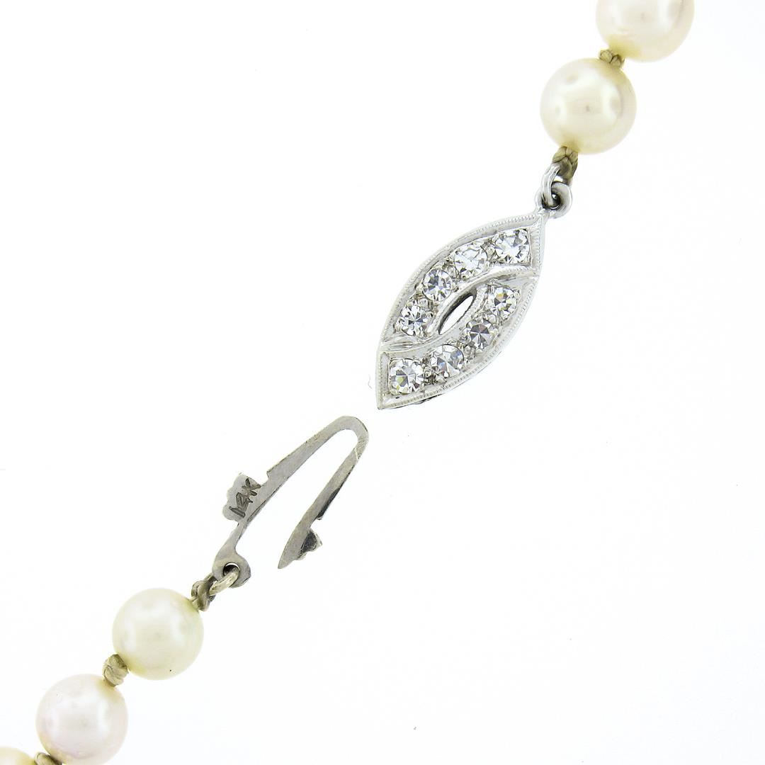 A vintage strand necklace with 14k white gold clasp, featuring 59 GIA graded near round shape cultured akoya pearls (5.34 mm to 10.20 mm), and 16 old single cut natural diamonds (F/G - VS1/VS2 ; 0.64ctw). 21 inch strand link chain, 37.80 grams total weight. Comes with all original relevant certifications.