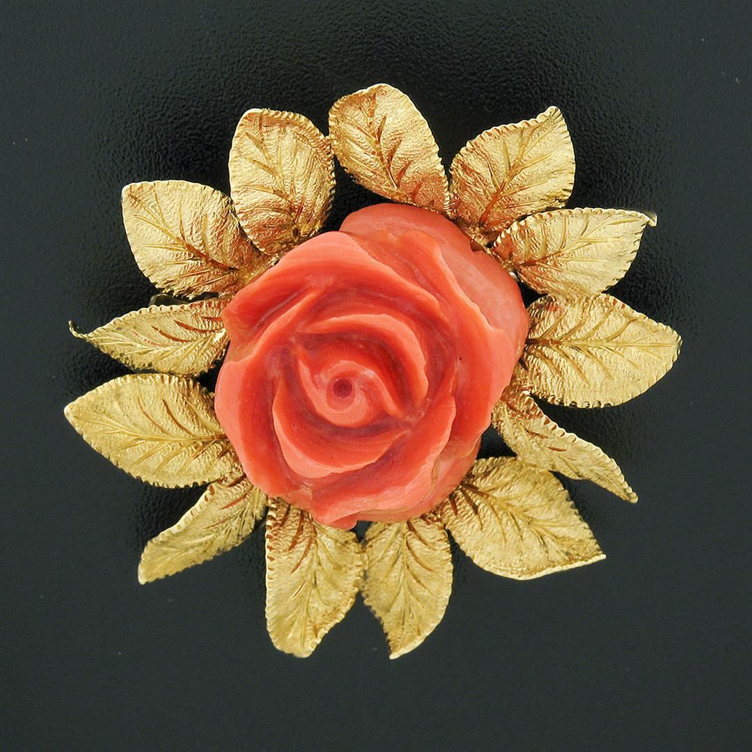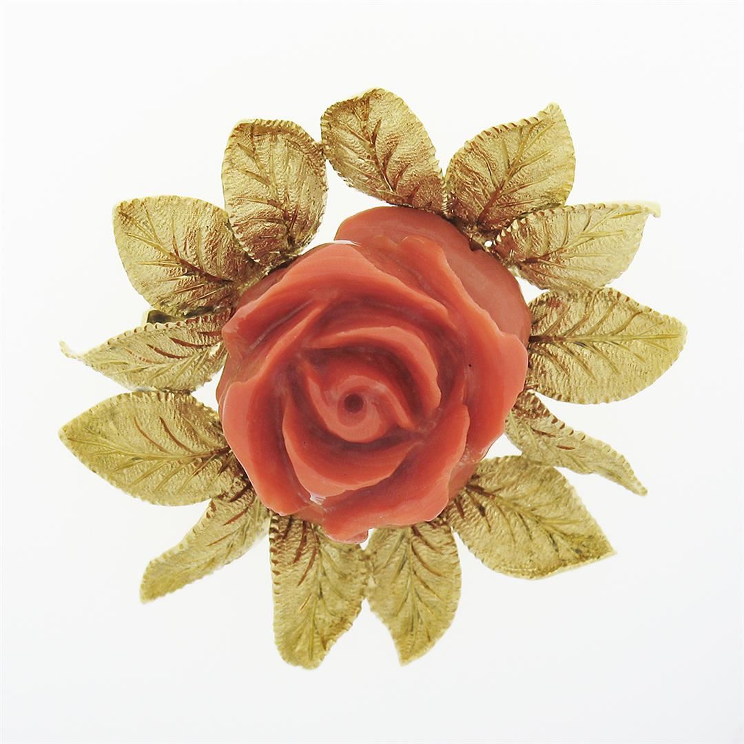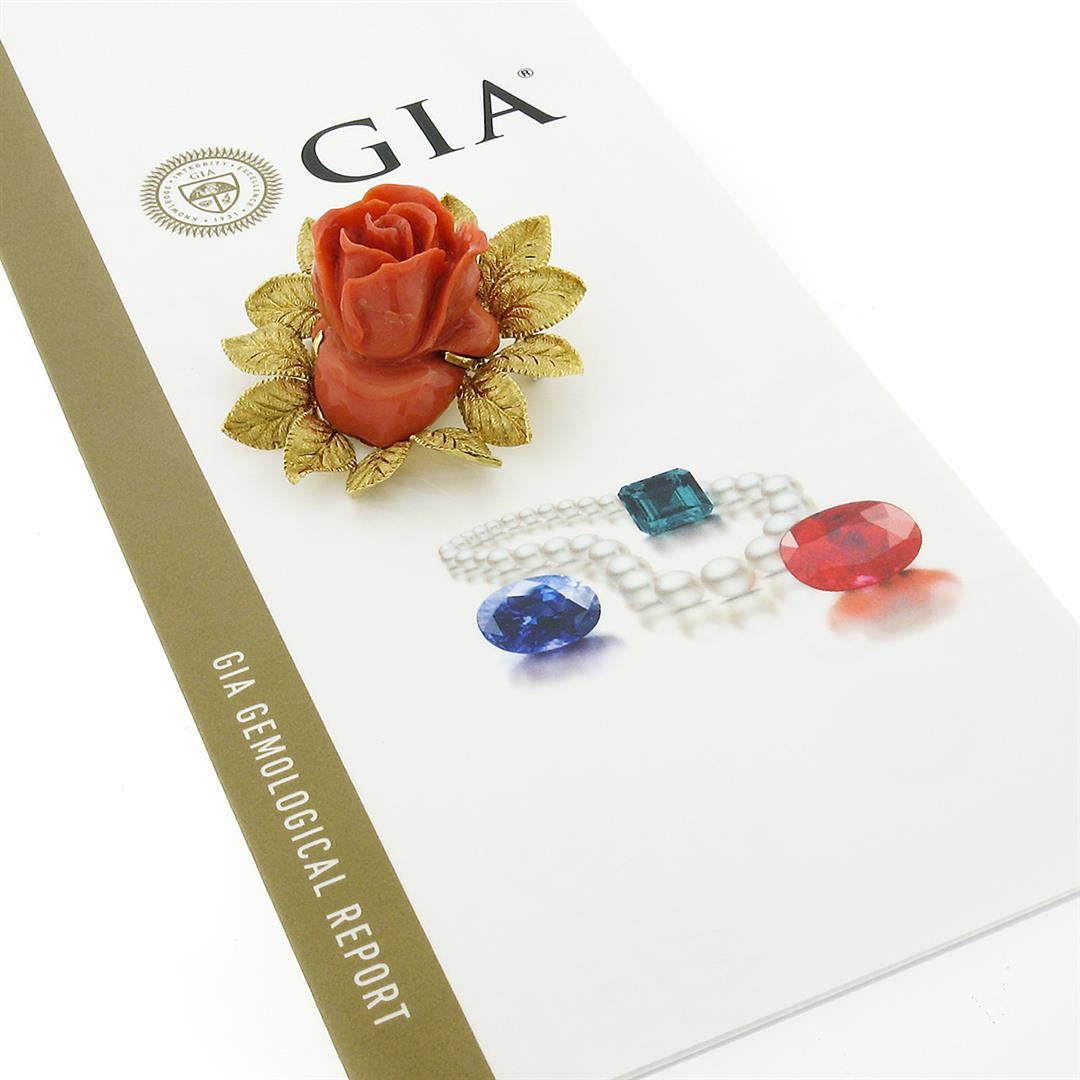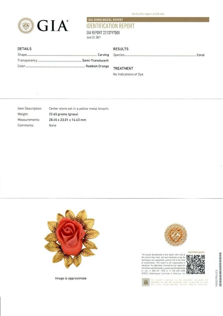 A solid 18k yellog odl pin brooch, with 1 Gia certified carved rose shape natural coral (28.45 x 23.01 x 14.43 mm - 22.65 grams). Measures 46.25x45.20mm and weighs a total of 22.65 grams. Comes with all original relevant certifications.