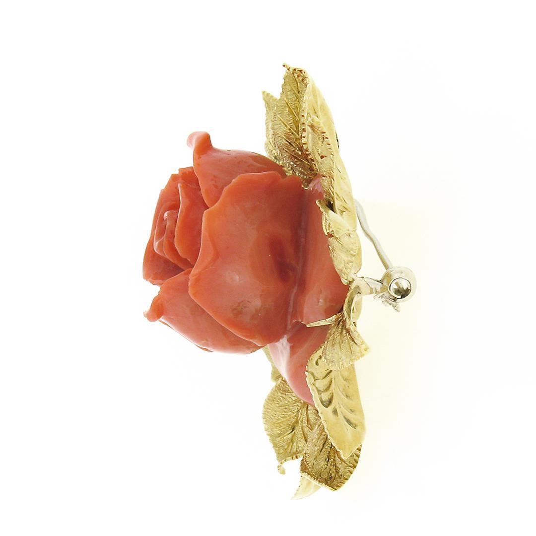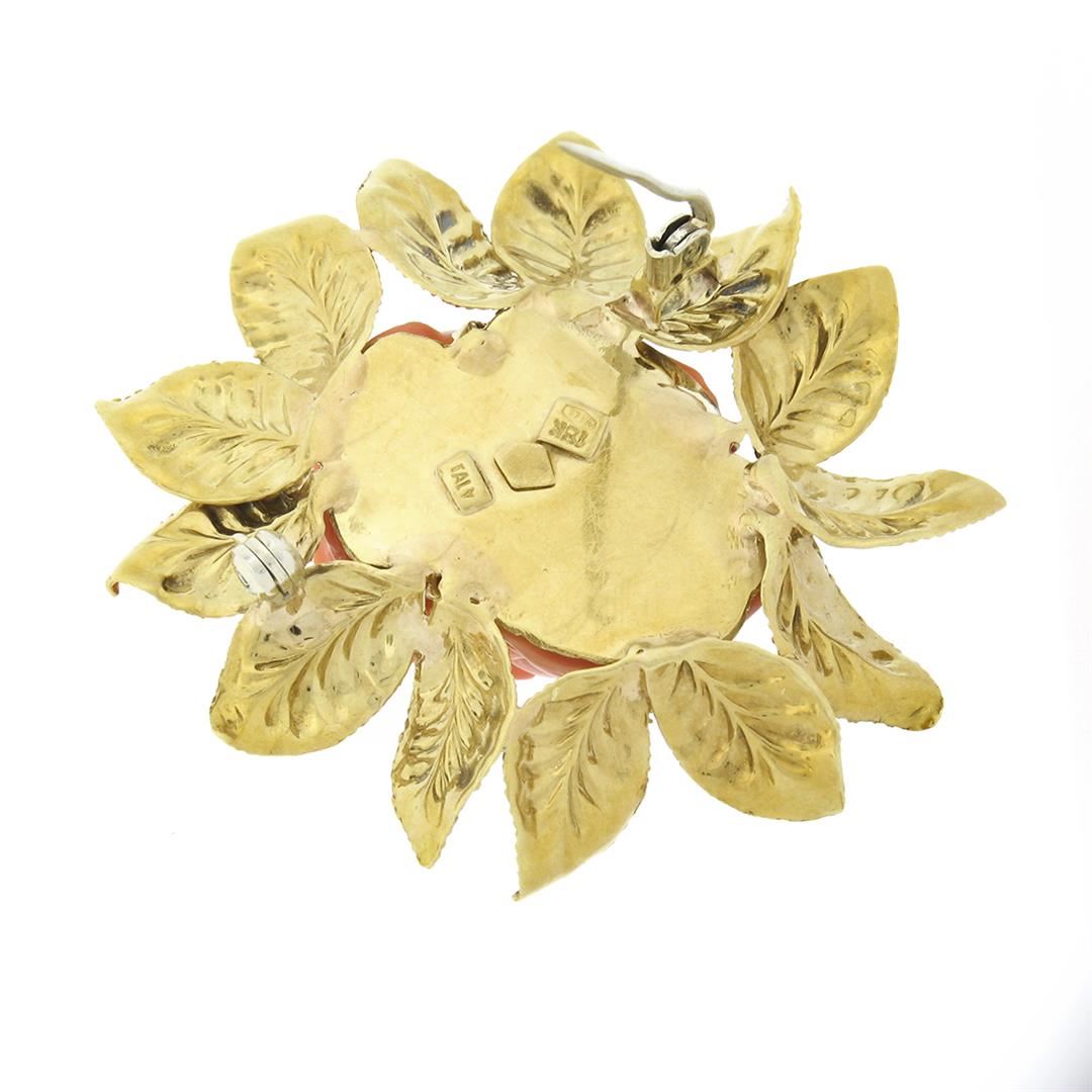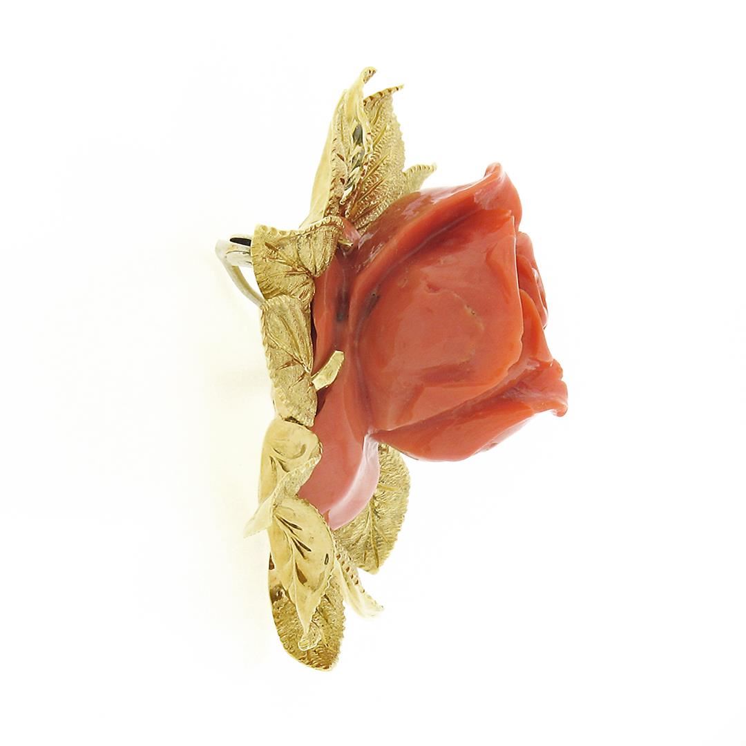 A solid 18k yellog odl pin brooch, with 1 Gia certified carved rose shape natural coral (28.45 x 23.01 x 14.43 mm - 22.65 grams). Measures 46.25x45.20mm and weighs a total of 22.65 grams. Comes with all original relevant certifications.