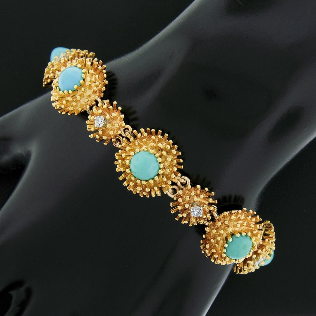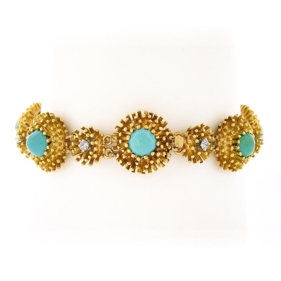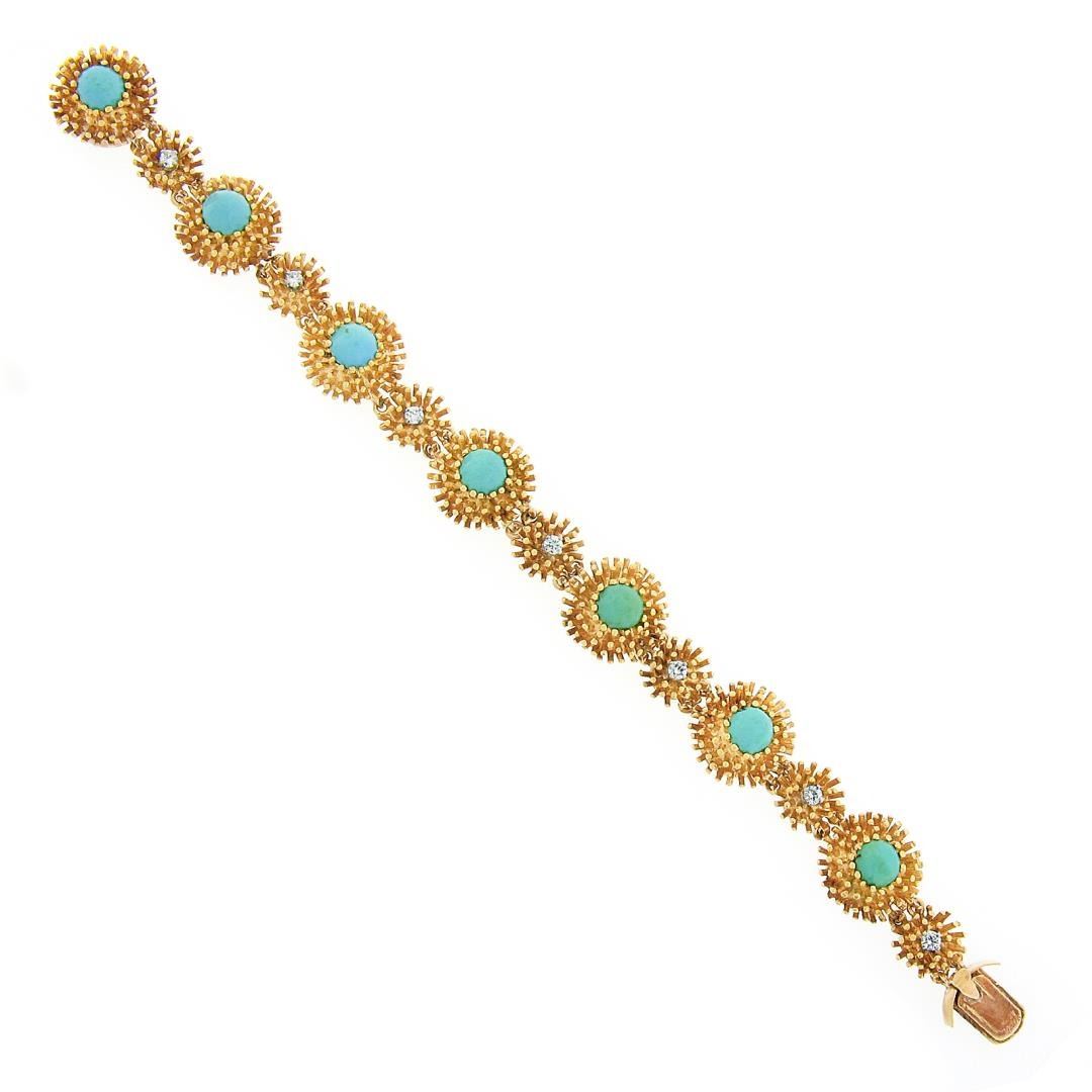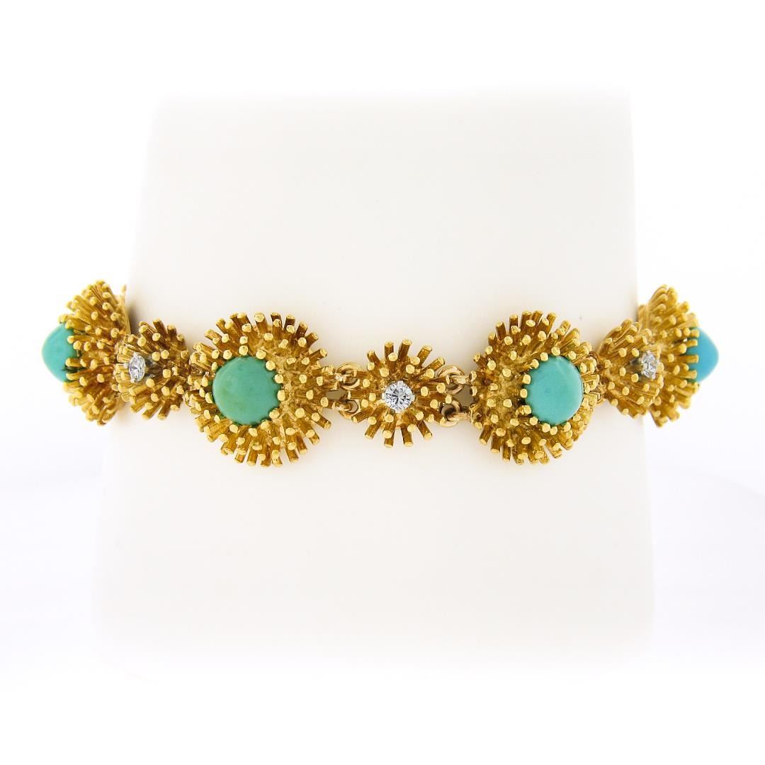 A vintage solid 18k yellow gold handmade link bracelet, with 7 round brilliant cut natural diamonds (F/G- VS1/VS2 ; 0.45ctw), alternated with 7 round cabochon cut natural turquoises (6.9mm each). It weighs a total of 44.71 grams, measures 16mm wide, and measures 7 inches in length.