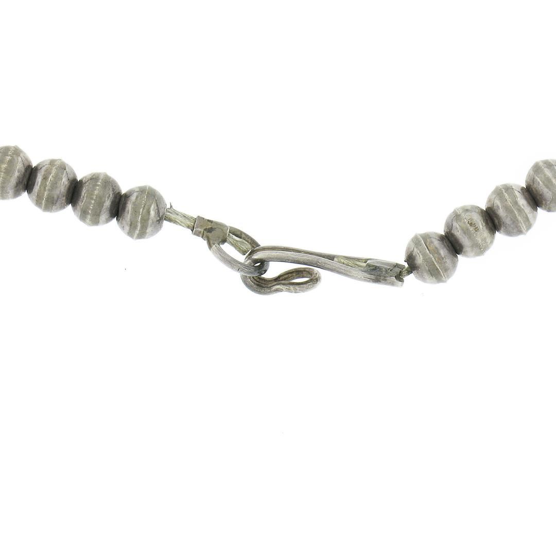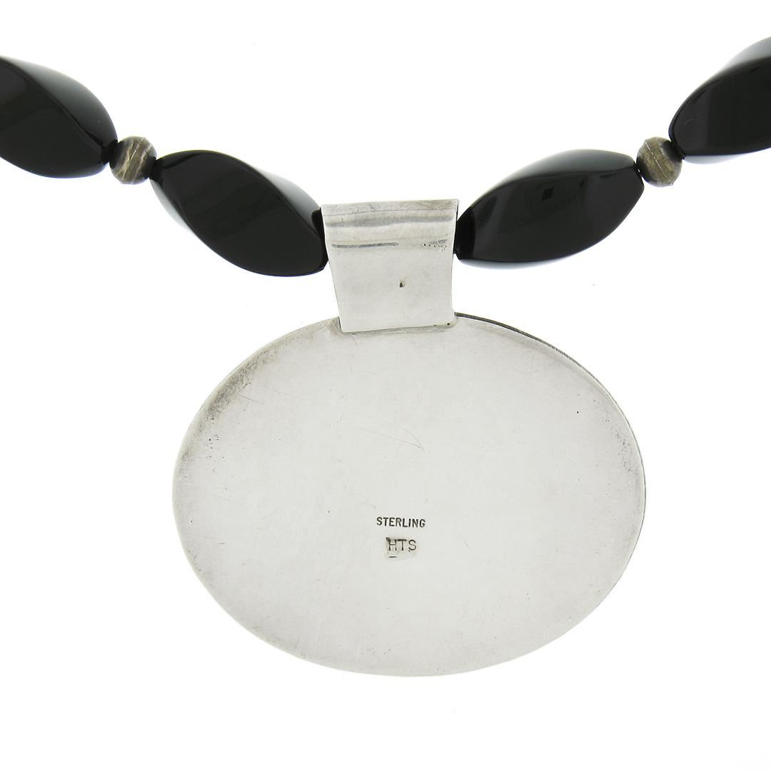 A vintage silver navajo pendant necklace, with 15 natrual black onyx (18.6x10mm), & 1 oval cabochon cut natural black onyx (39.8x29.7mm). 18 inch bead link chain, 71.3 grams total weight, pendant measures 49.4x48.6mm.