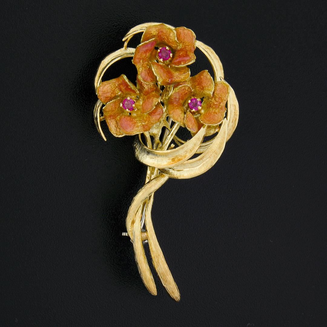 Vintage Italian 18k Gold 0.10 ctw Ruby Textured Floral Brooch Pin w/ Enamel Work