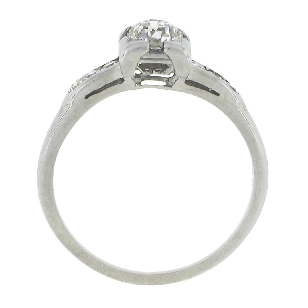 A vintage solid 18k white gold engagement ring by JABEL, featuring 1 GIA graded old European cut natural diamond (J - SI1 ; 0.49ct), and 6 old single cut natural diamonds (G-H - VS2-SI1 ; 0.08ctw). The ring is size 6.0, weighs a total of 2.05 grams, and measures 6mm wide. Comes with all original relevant certifications.