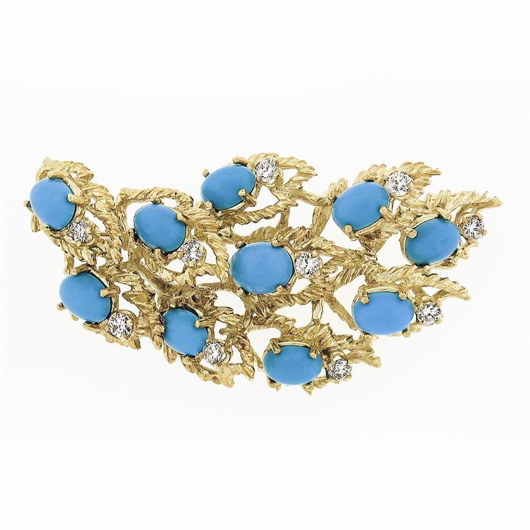 A vintage solid 18k yellow gold pendant brooch by Jack Gutschneider, with 10 round brilliant cut natural diamonds (G/H VVS2/VS1 ; 0.90ctw), and 10 oval cabochon cut natural turquoise (7.15x5.15mm). Measures 56.86x27.87mm and weighs a total of 20 grams.