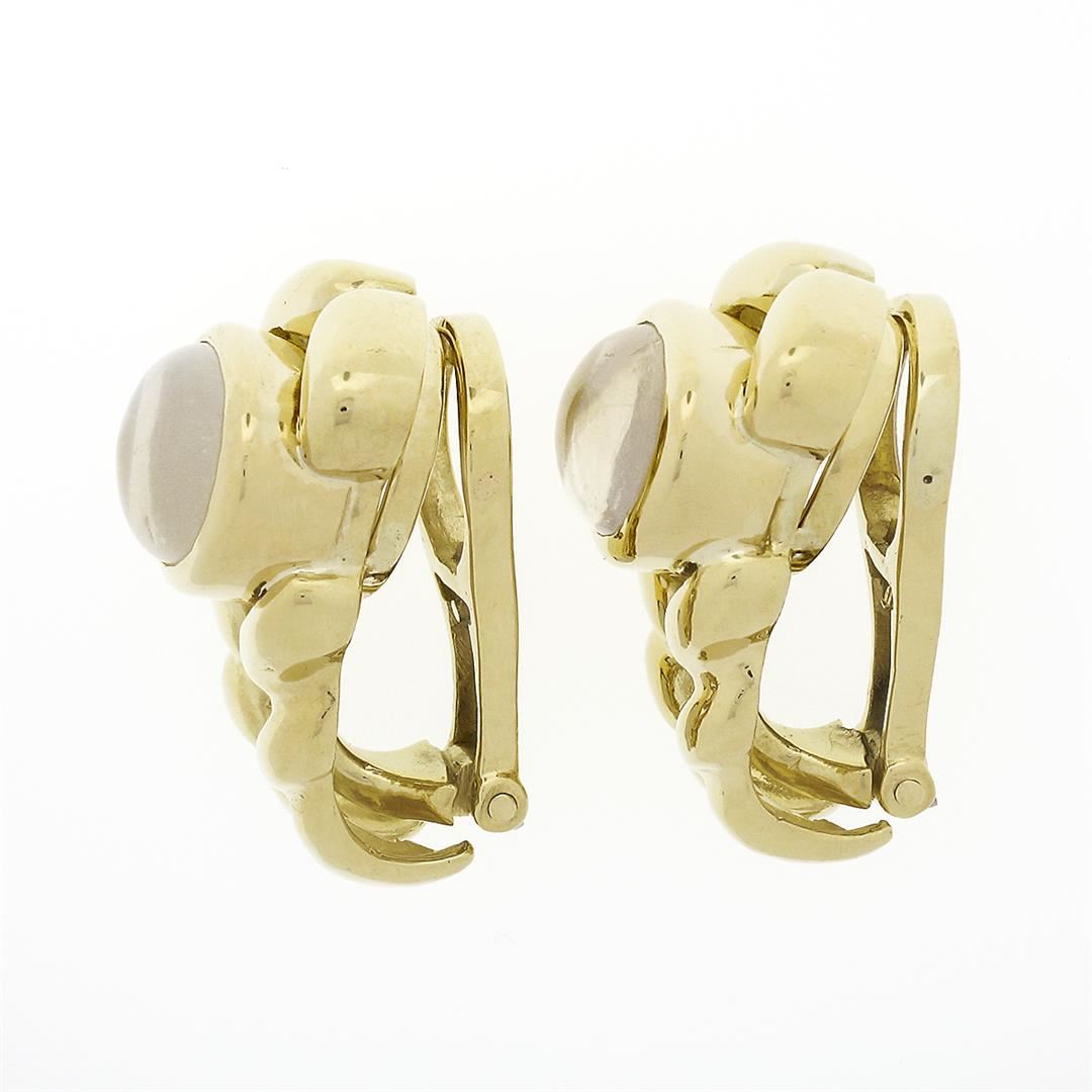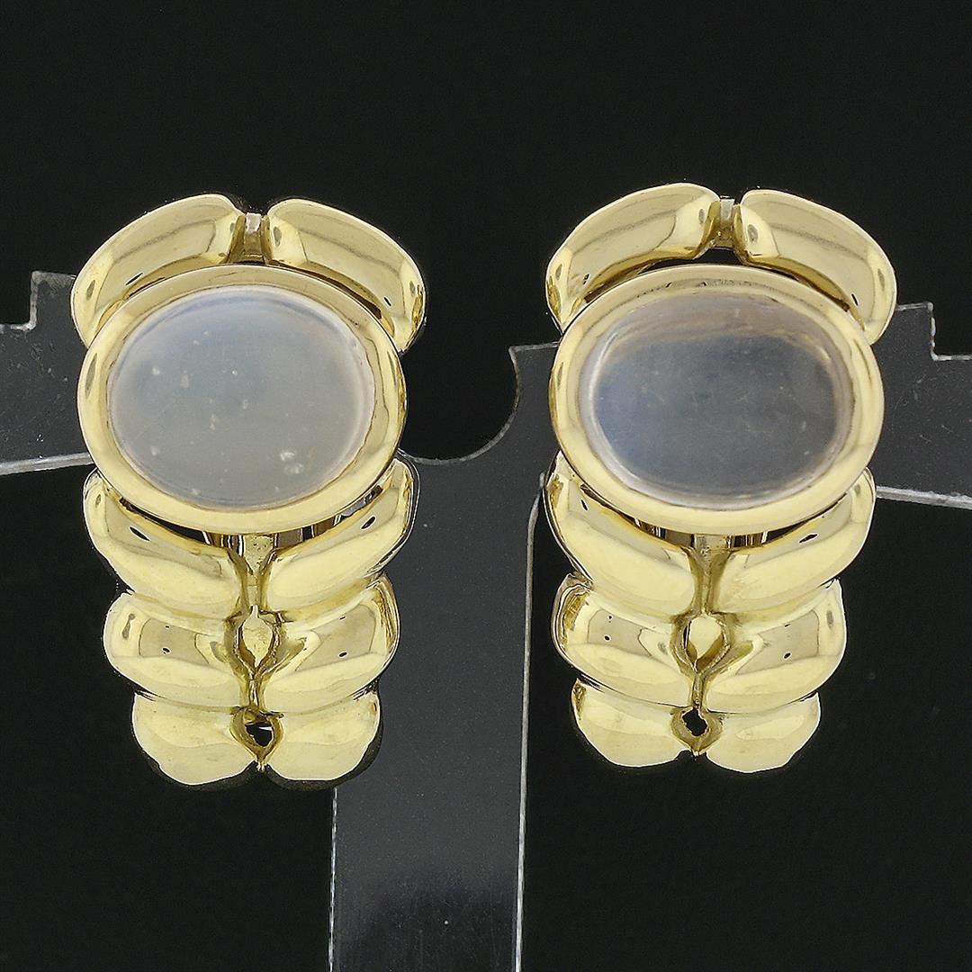 A vintage solid 18k yellow gold cuff earrings by Kaufmann De Suisse, featuring 2 oval cabochon cut natural moonstone (10.45x8.8mm).The earrings measure approximately 25.3x14.65mm and weigh a total of 23.67 grams.
